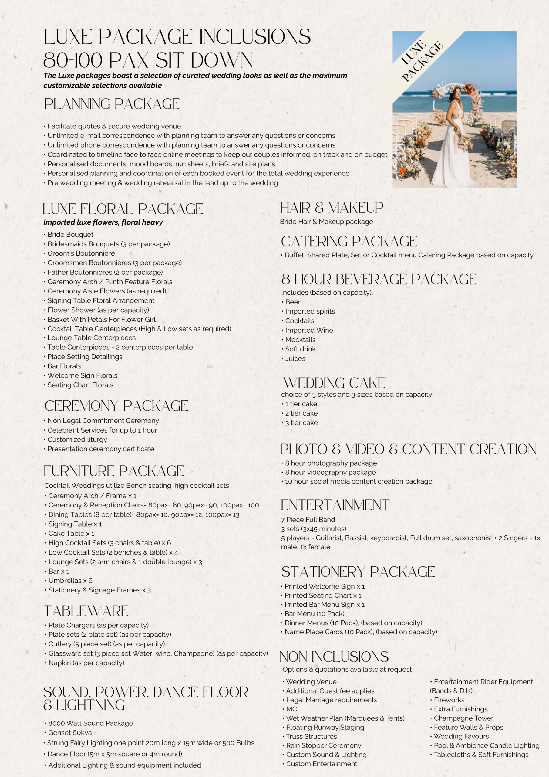 There are three distinct wedding package tiers; Luxe (Premium offering),  Classic (Quality Standard offering) and Essential (Quality Base offering), each designed to provide varying levels of inclusions and reflect different price points.