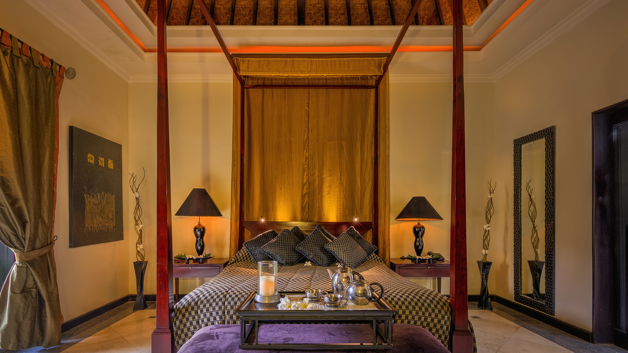King Bedrooms - Two luxurious master suites face each other across the pool and furnished with king-sized, contemporary four-poster bed, vanity and couch. Outdoor furnished terrace with private plunge pool. Lavish ensuite bathroom featuring large sunken-baths, room-size walk-in shower, his n’ hers washbasins and small courtyard. Satellite TV and DVD player. Air-conditioned.