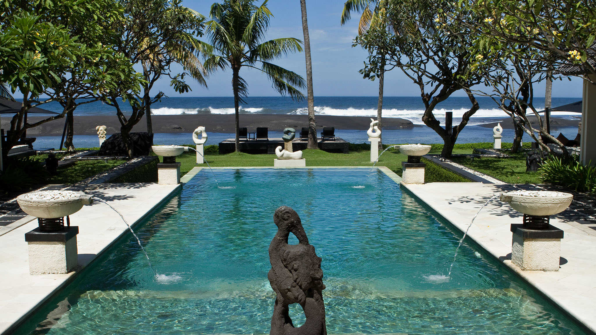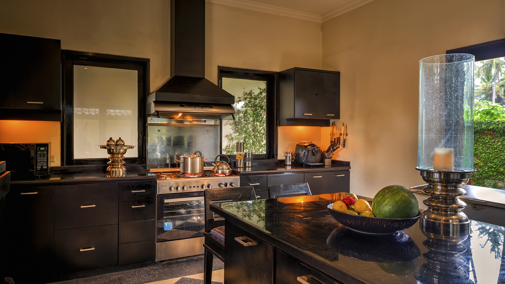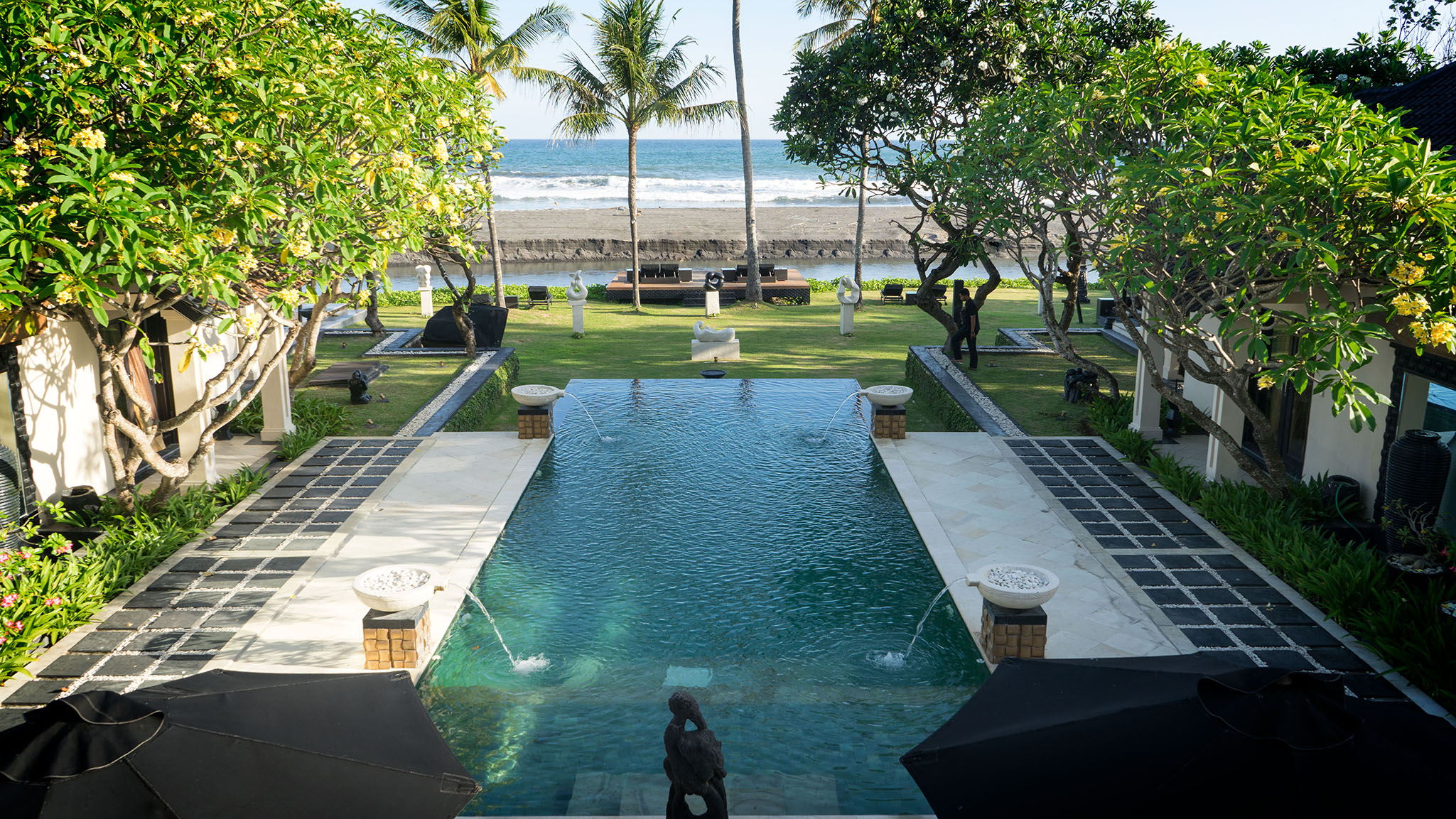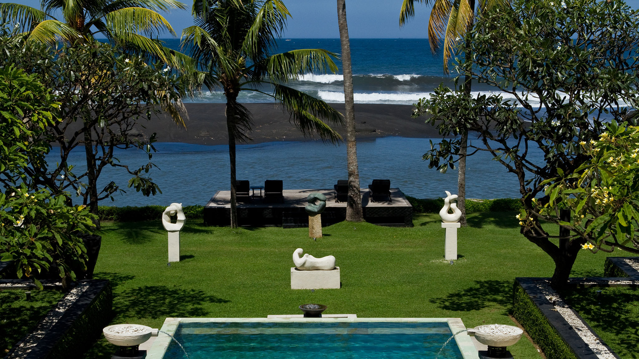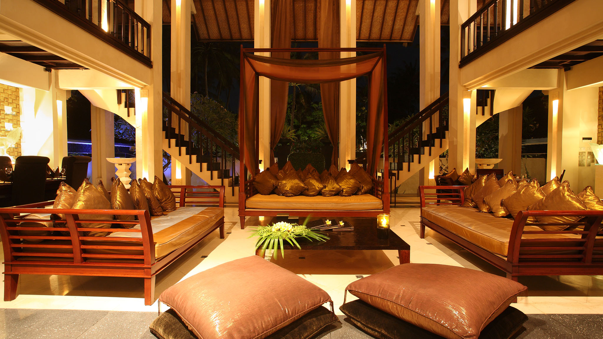Indoor Living - Two-story main pavilion with 11m high atrium featuring an open-sided living and dining area with various spaces for relaxation. Formal dining area accommodating 12-14 people. Separate, fully-equipped kitchen. Air-conditioned theatre room equipped with satellite TV, DVD and wall-projected movie screen, large sofas and well-equipped office. Mezzanine-style gallery provides and two intimate dining space and a centrally-positioned balcony with bi-fold glass doors.