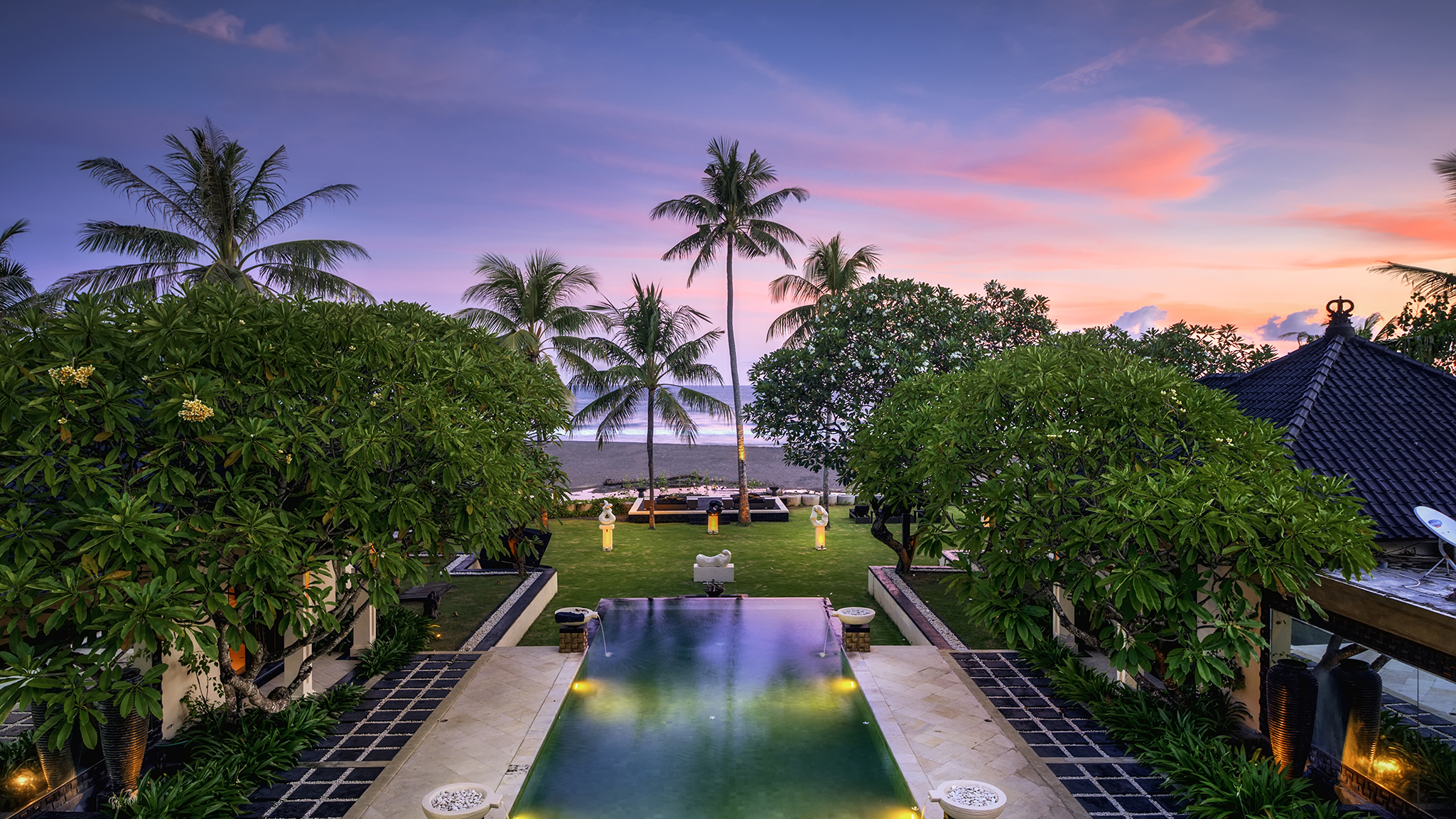Living Areas - Two-storey main pavilion with living–dining area; fully equipped kitchen; movie studio theatre; upper gallery with spa and massage deck plus meditation deck; 2 garden balés.
