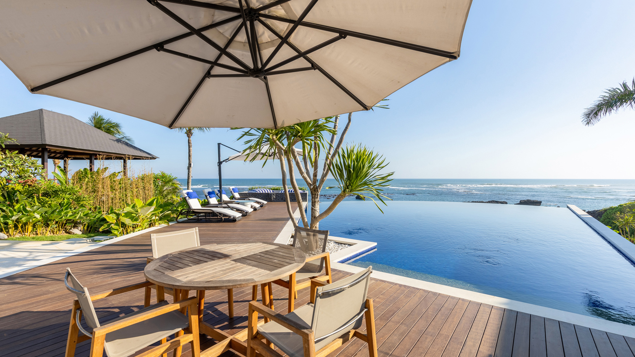 Outdoor Living - A 14-metre infinity swimming pool to cool down on hot island days. Pool deck fringed with tropical gardens, featuring sun loungers and sunbrellas. Garden balé with koi ponds and water features. Shaded veranda with a lounge, dining area, and a teak daybed. Terraced lawns ideal for weddings and large events.Alfresco dining areas to enjoy delicious meals under the stars .
