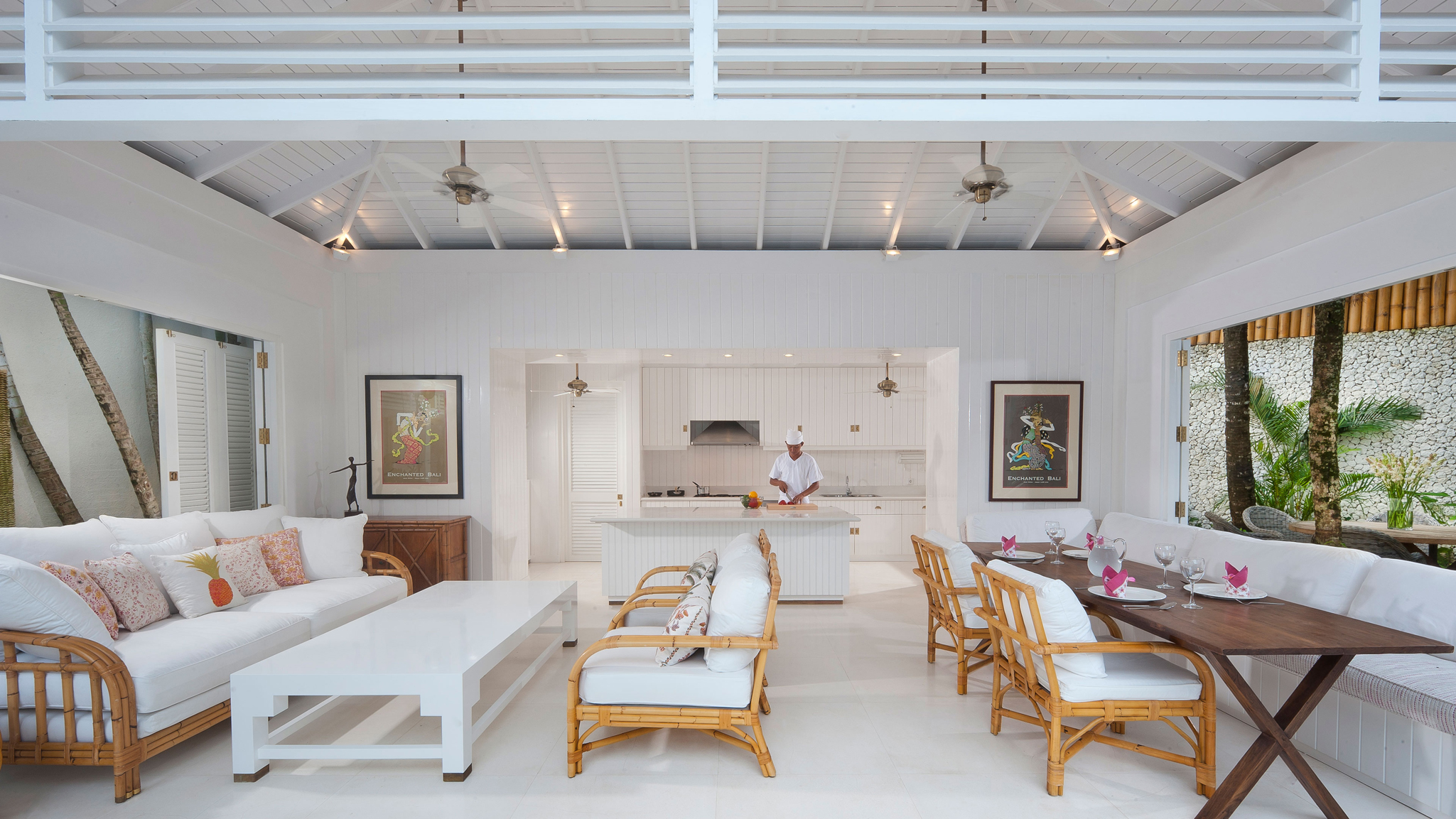 Indoor Living - Spacious, open-fronted elegant dining room seating up to eight guests. Fan cooled living area with large comfortable couches and cushioned club chairs, flat screen TV, DVD player, books, Bose sound system with iPod dock, loaded iPod and library.. Charming garden pavilion with cushioned rattan daybeds and deep sofas. Fully equipped, fan cooled kitchen with a lounge area and casual dining for eight people..