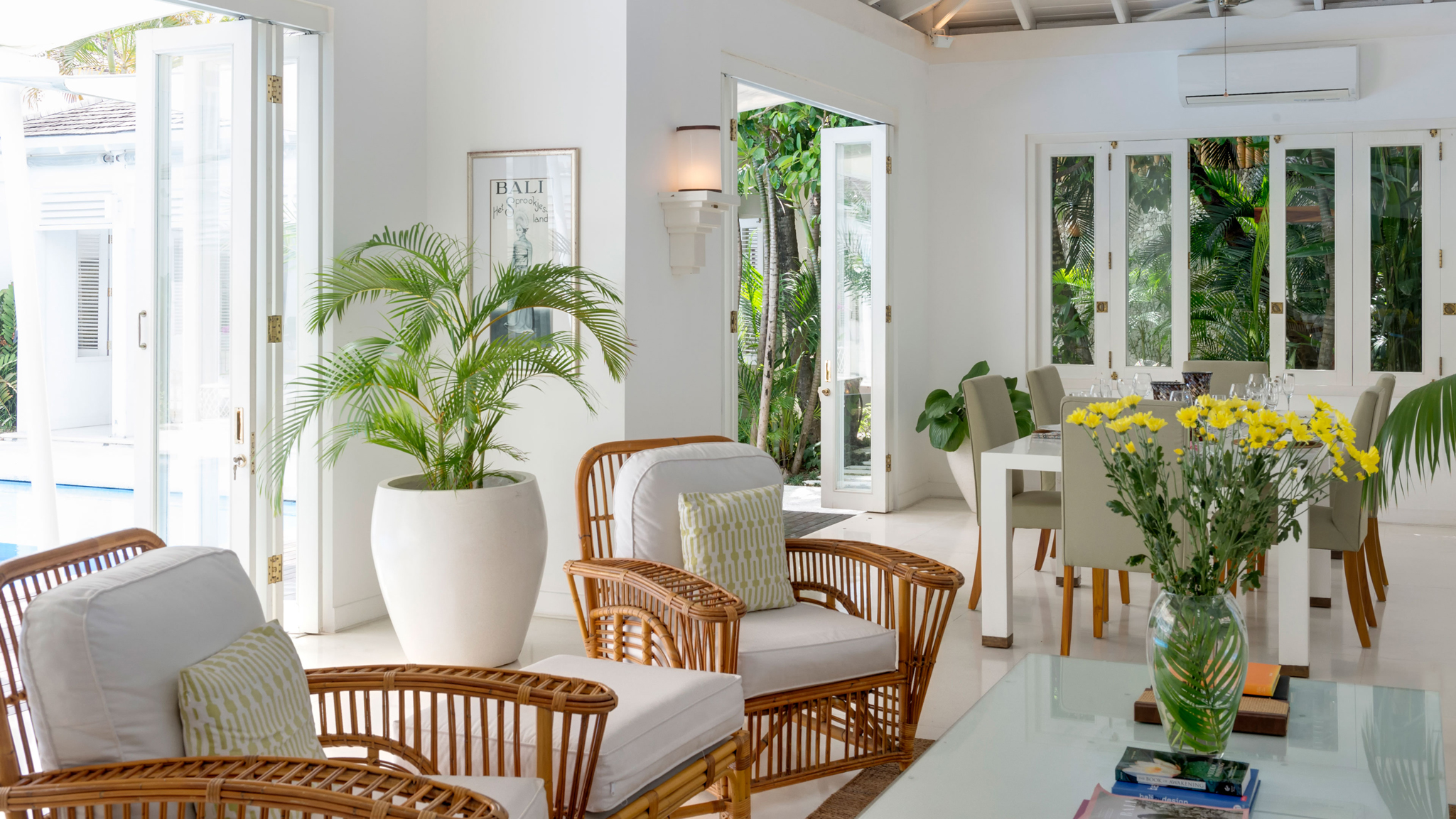 Guest Rooms - Both situated on the ground floor of the sleeping pavilion. Tropical style sets a chic tone. Furnished with king size beds and rattan trunks. Ensuite bathrooms.