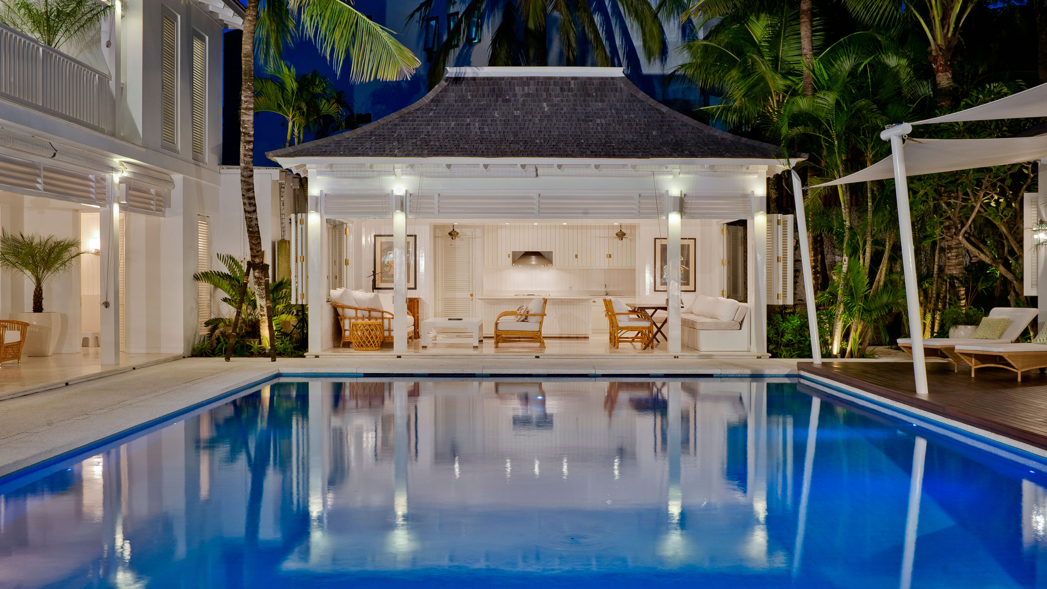 Outdoor Living - Landscaped tropical gardens. 14-metre pool, beautifully lit at night. Large stone terraces furnished with sun loungers and cushioned club chairs. Covered terrace with seating of comfortable chairs and occasional tables overlooking the pool. Eight-seater dining table for tropical alfresco feasts.