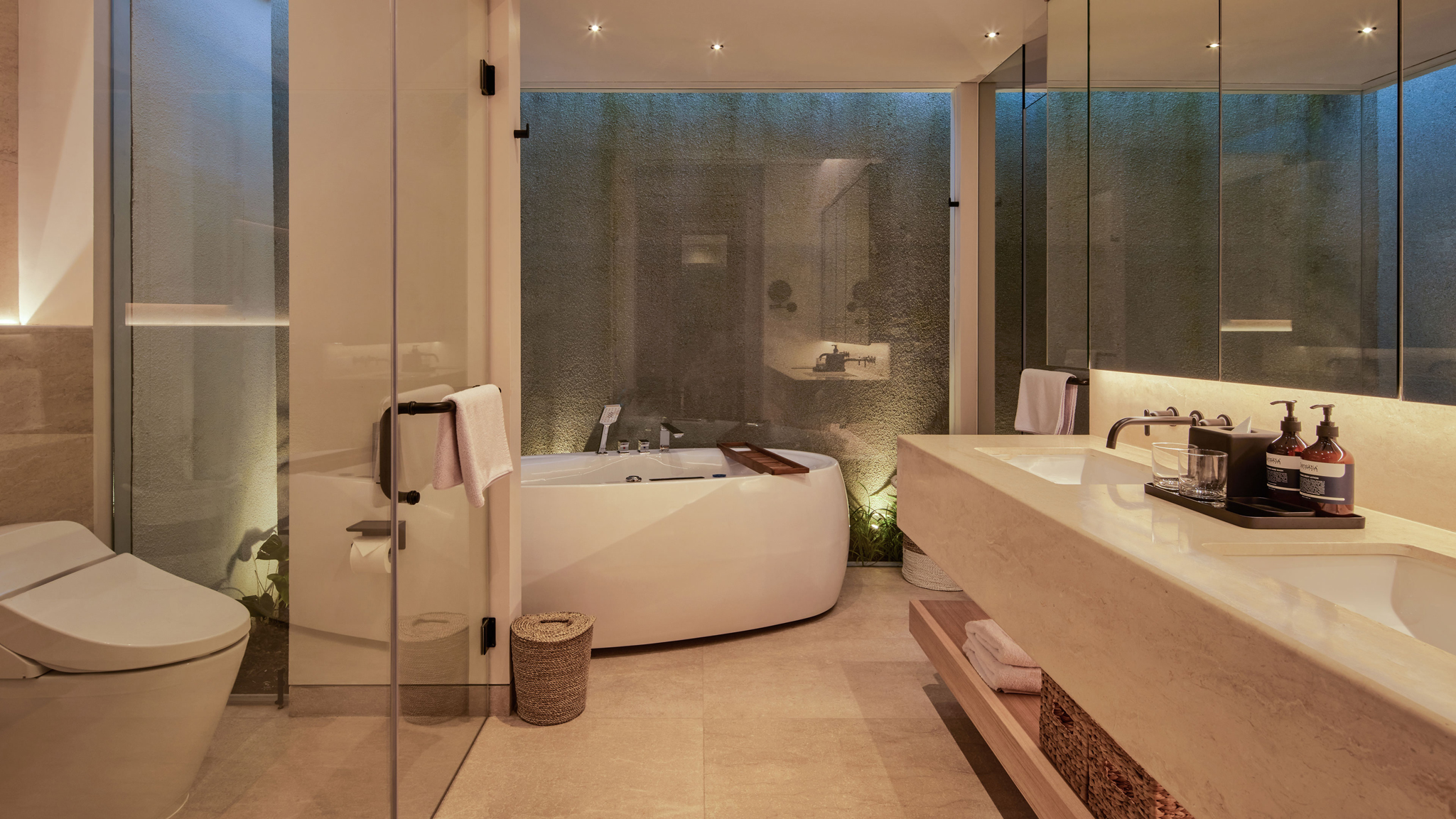 Master Bedrooms 1 & 2 - Located on the ground level, perfect for elderly guests. King-size beds with bedside tables and bamboo hanging lamps. Study desks in both the rooms. Ensuite bathrooms with standalone jacuzzis, replete with USB feature for music. Bathrooms are outfitted with high-end fittings by Toto and Hansgrohe. Large rain showers overlooking tropical greenery with bench seating. Master Bedroom 1 also has a sauna room.Ample storage, dressing area, safety deposit locker and air conditioning .