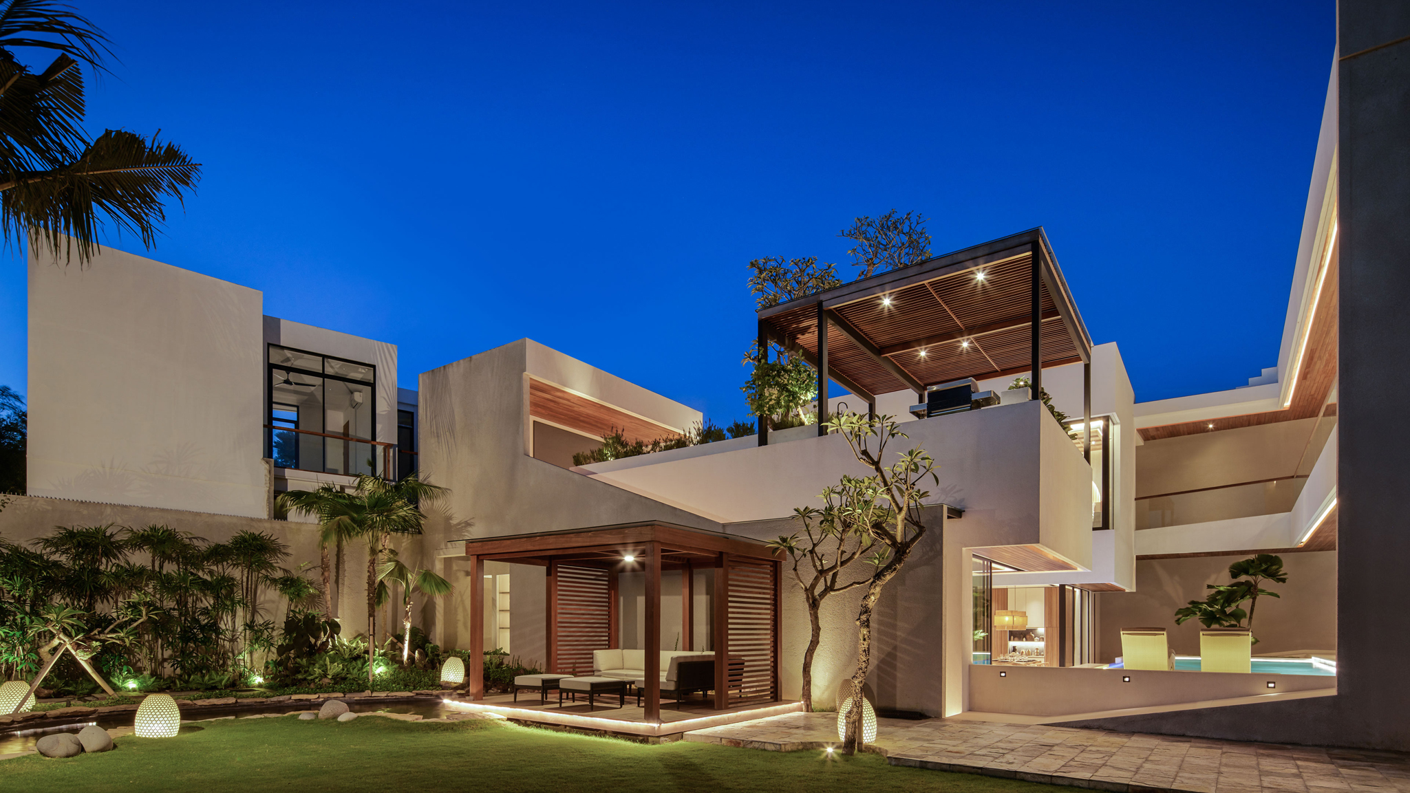 Outdoor Living - Infinity pool with concealed, colour-changing lights along the acrylic. Two sun loungers set atop a shallow platform in the pool. Splash pool for kids. Sunken outdoor living sala, great for evening cocktails. Tropical garden with tall palm trees and a Balinese temple. Koi pond with a water feature, and gazebo with sofa seating. Rooftop terrace with barbecue and alfresco dining for 10. Outdoor theatre with 150-inch projector screen and beanbags.