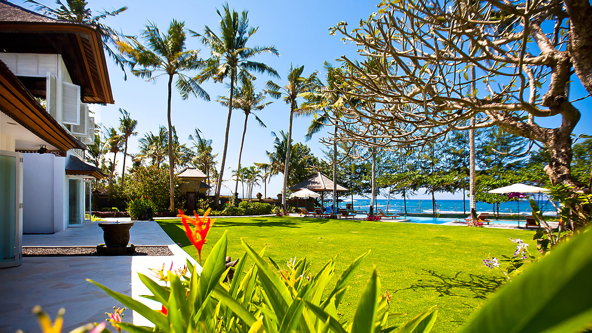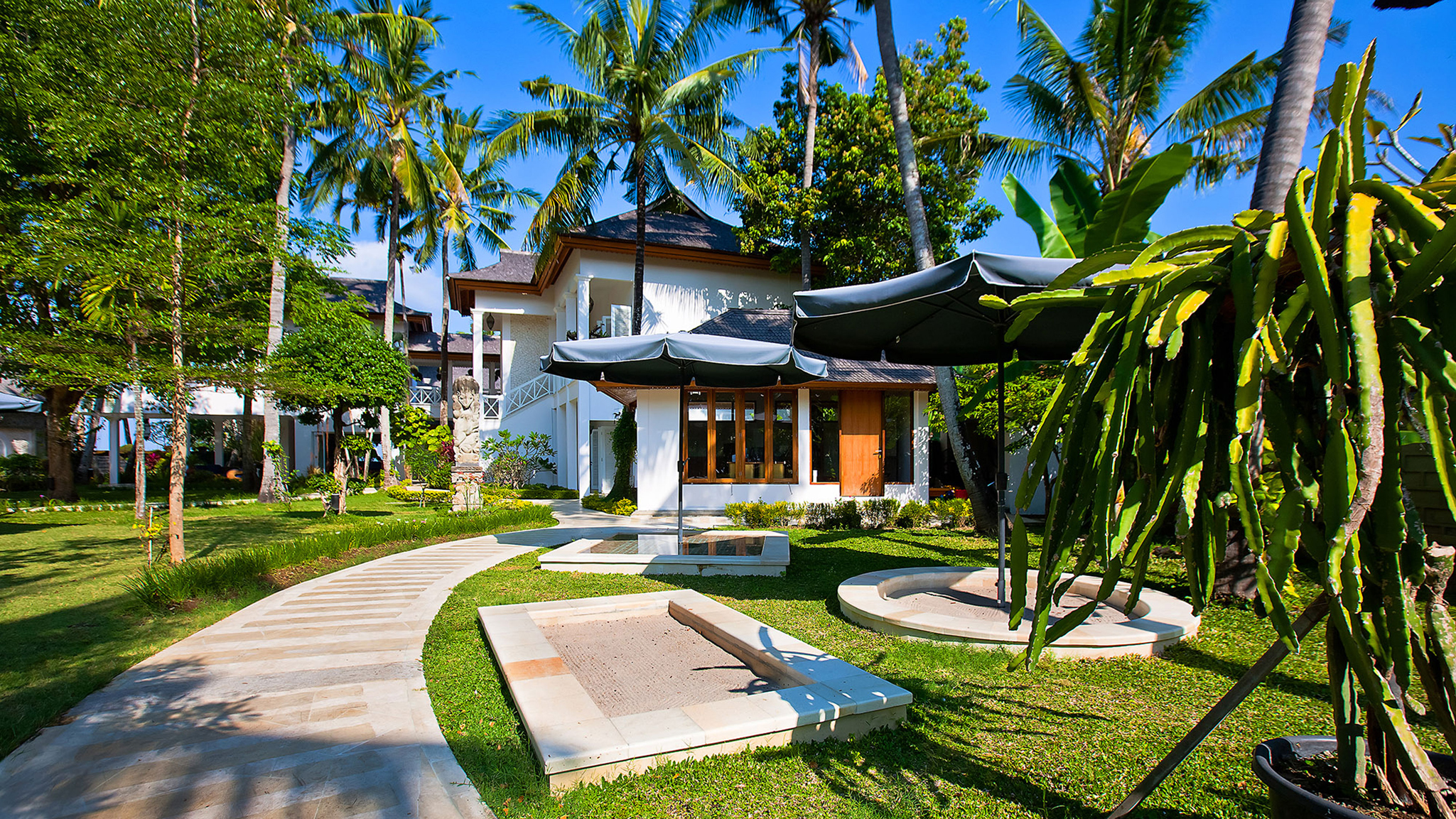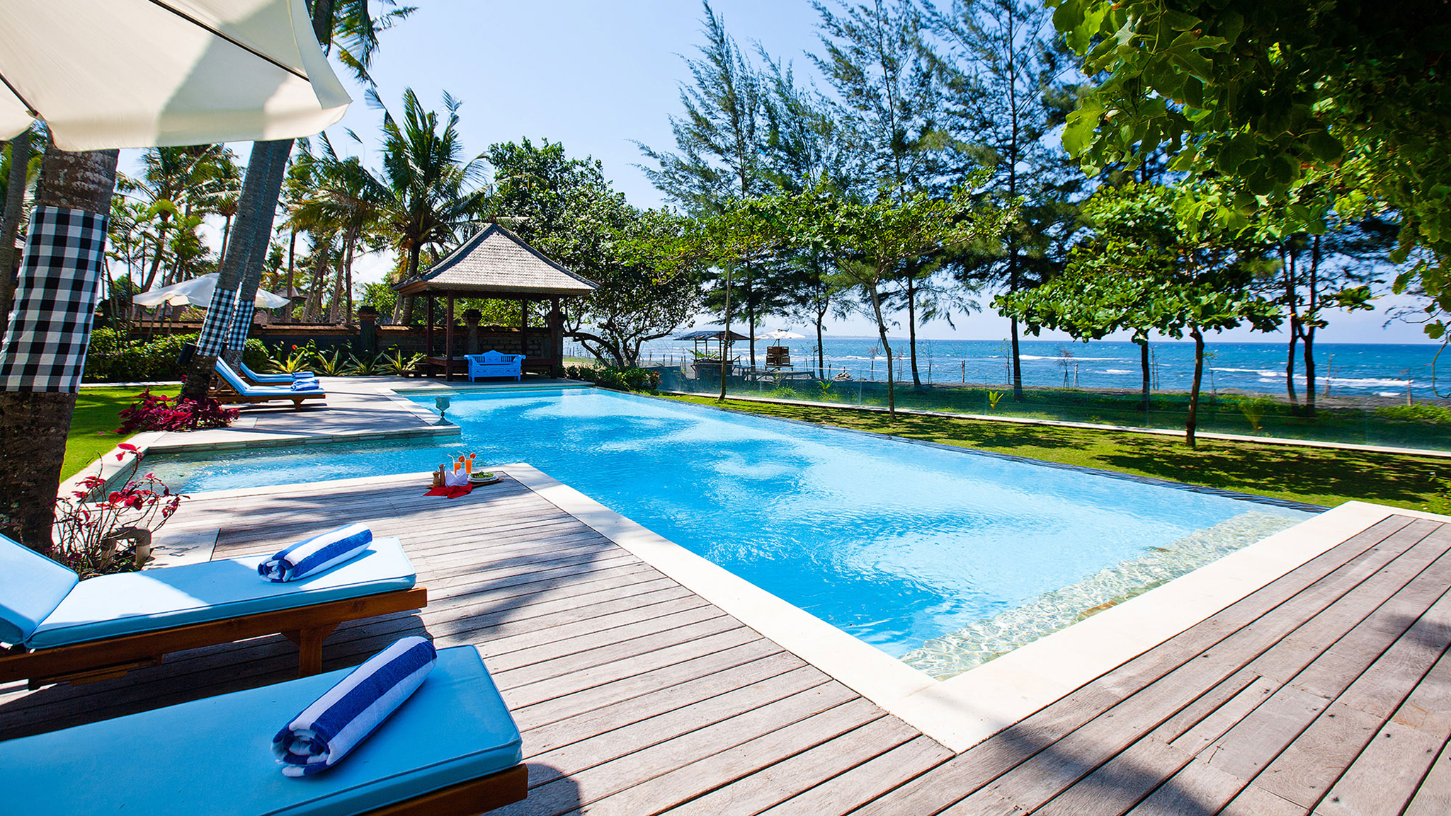 Outdoor living - 16-metre swimming pool with jacuzzi and kids wading section. Sun-deck with large beanbags and Balinese parasols . Alfresco poolside dining gazebo with seating for 12 . Cushioned poolside bale with beach views. Colonnaded entrance veranda with seating. Large gardens with kids play area and performance area  .