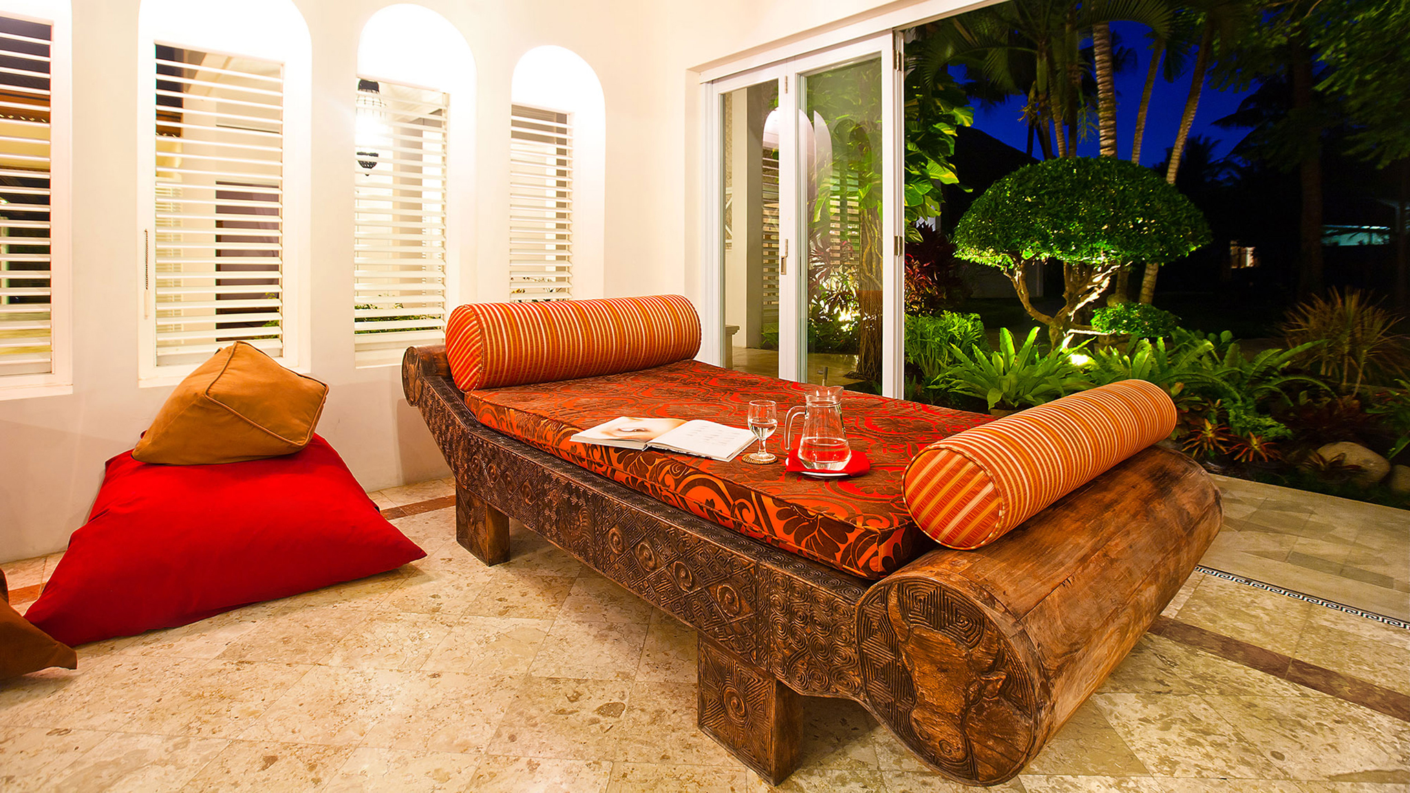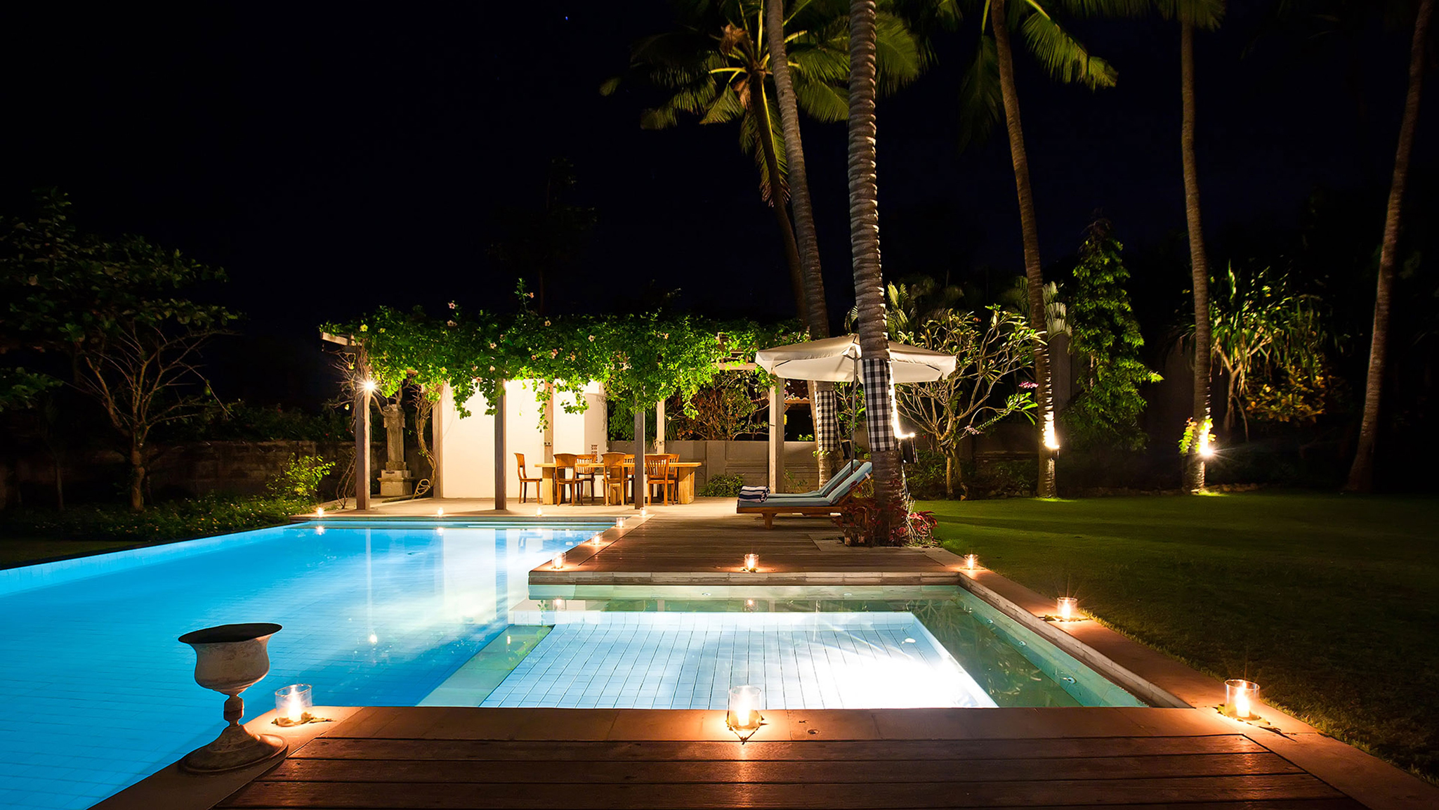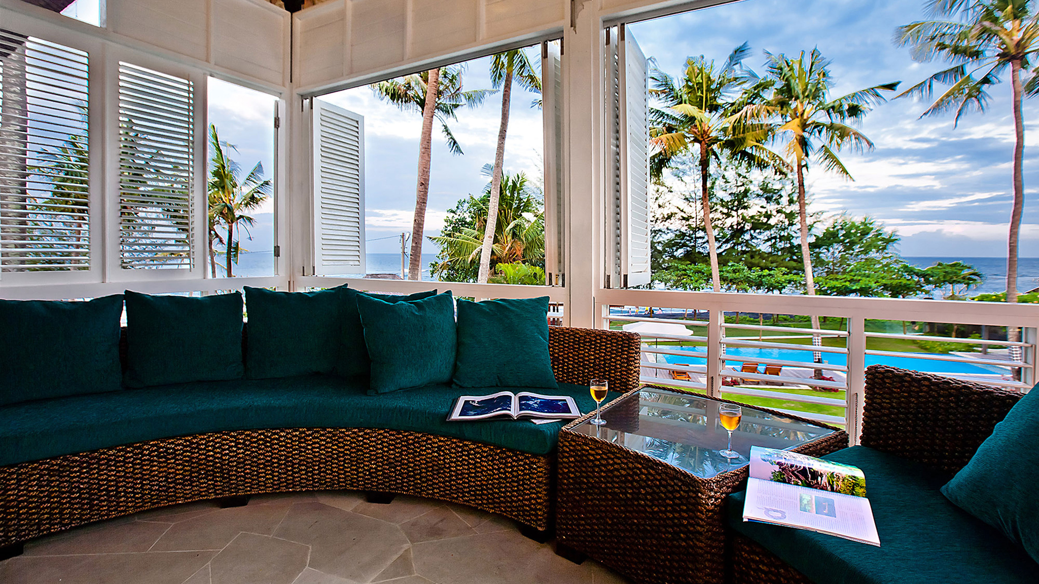 Outdoor living - 16-metre swimming pool with jacuzzi and kids wading section. Sun-deck with large beanbags and Balinese parasols . Alfresco poolside dining gazebo with seating for 12 . Cushioned poolside bale with beach views. Colonnaded entrance veranda with seating. Large gardens with kids play area and performance area  .