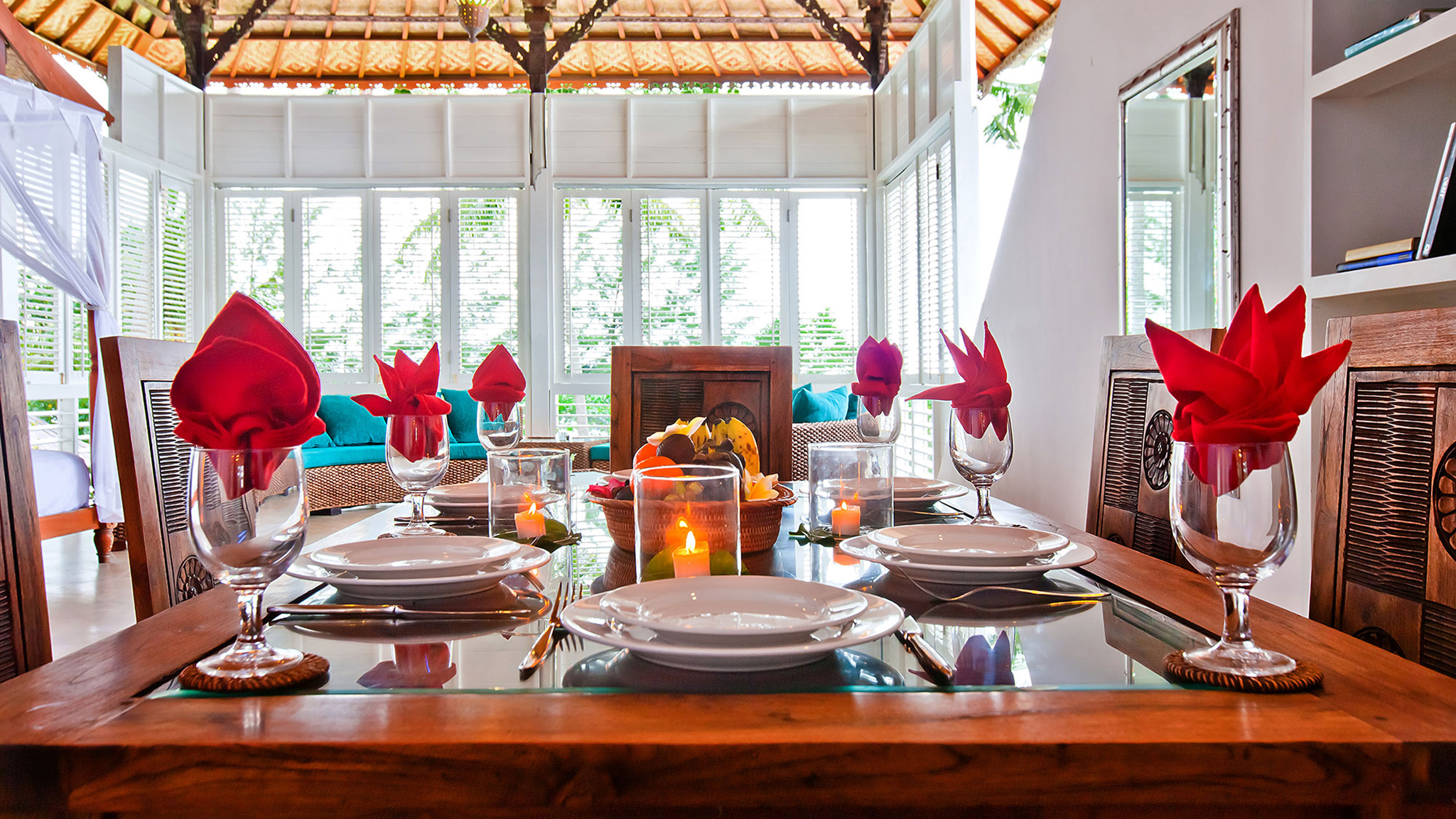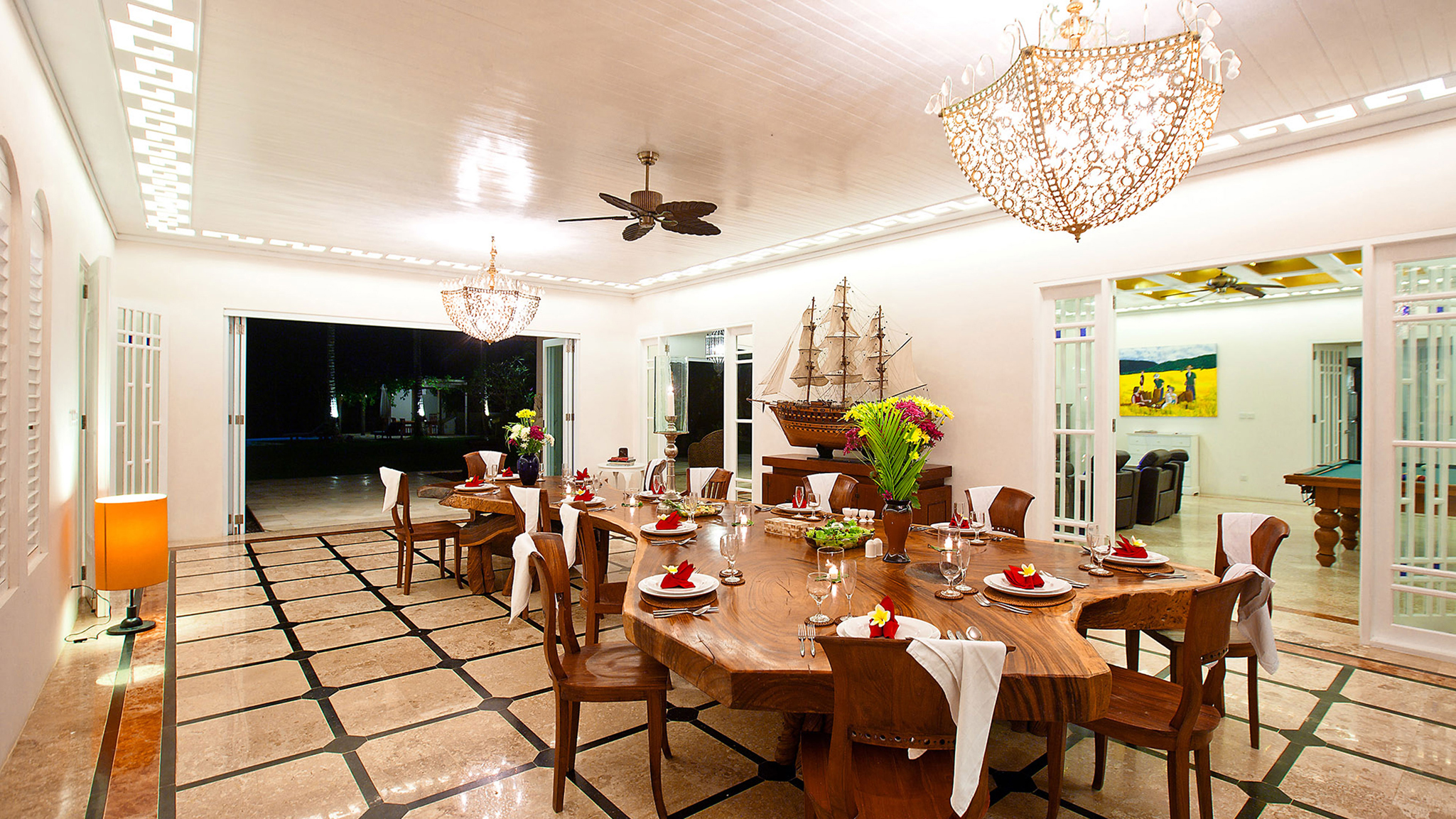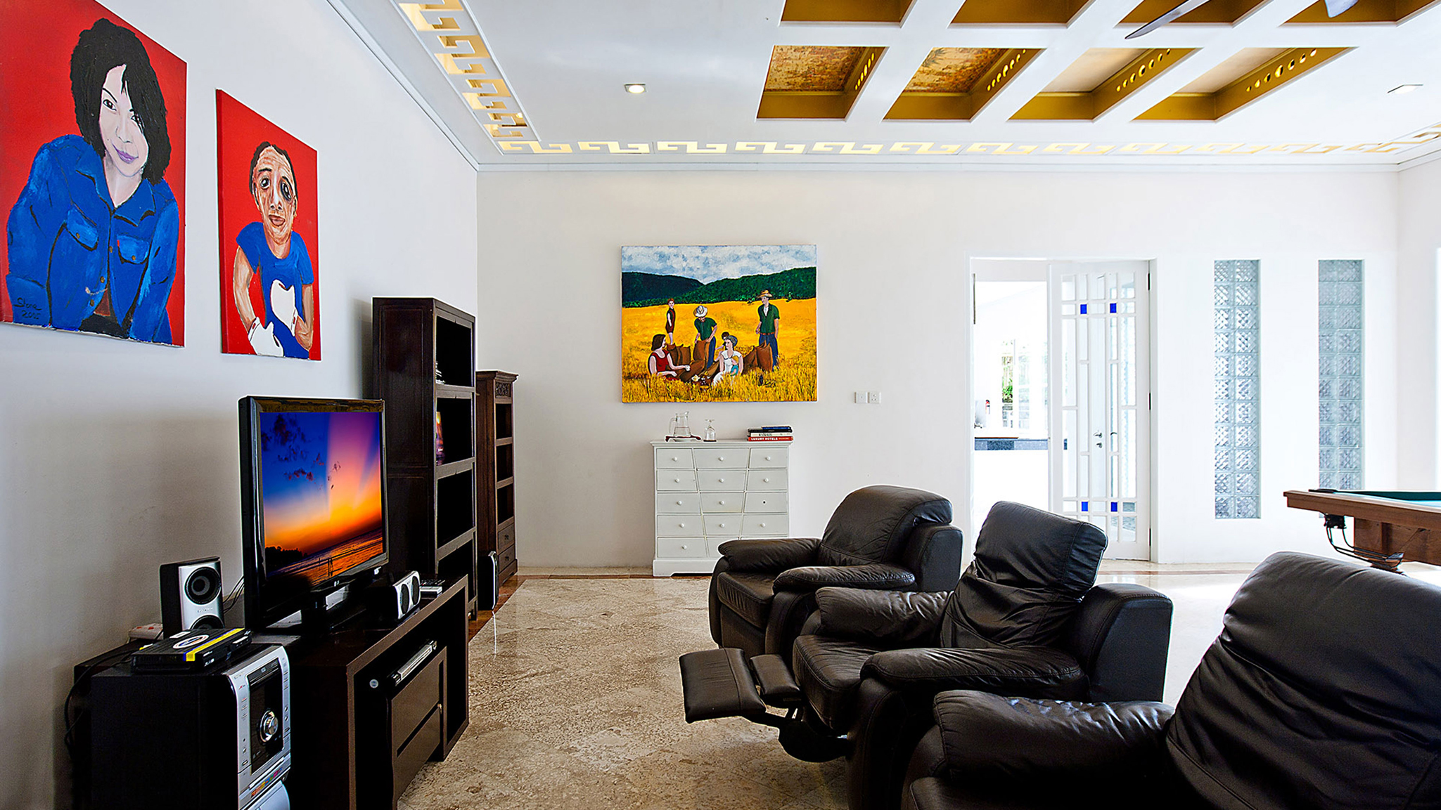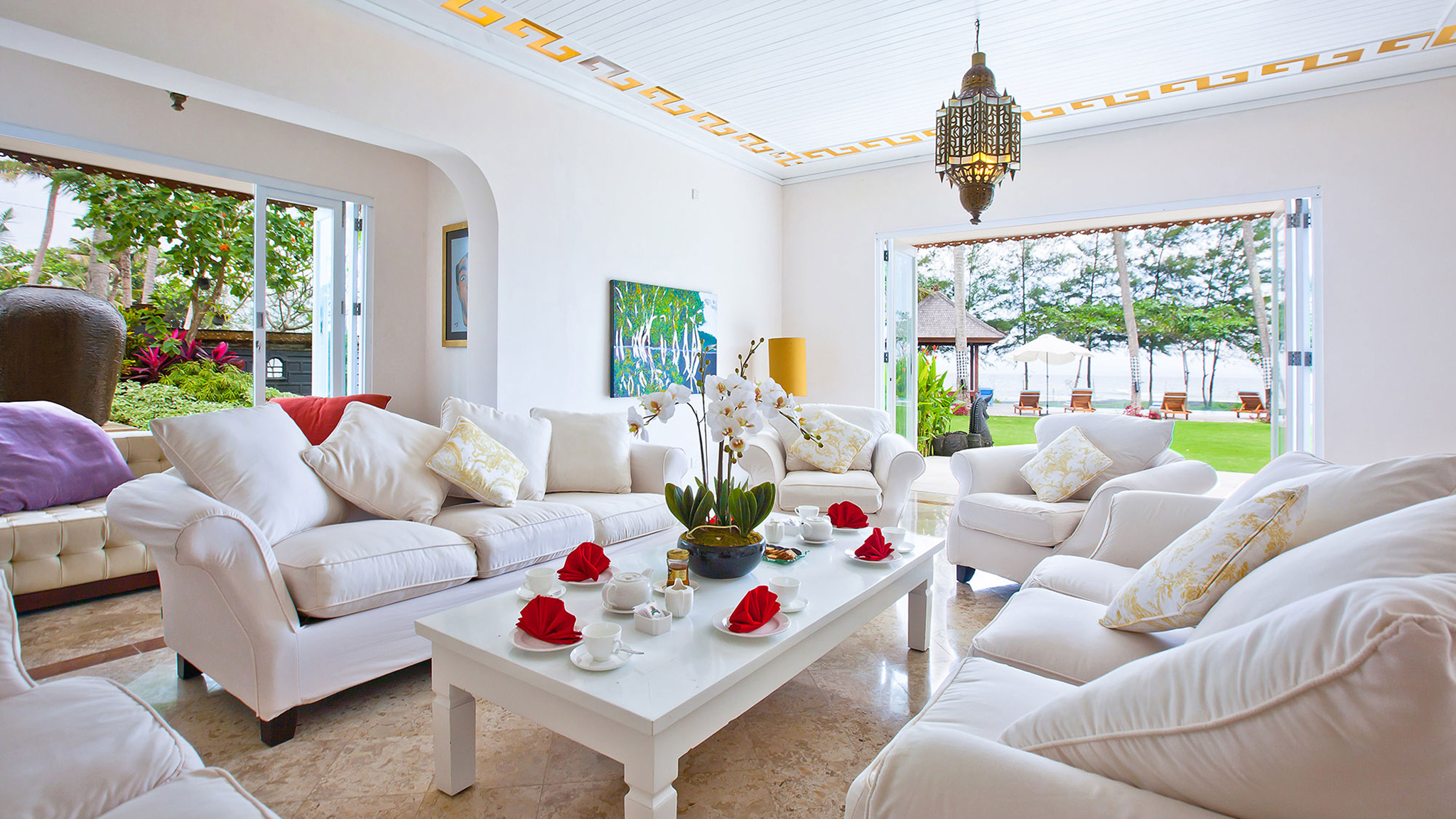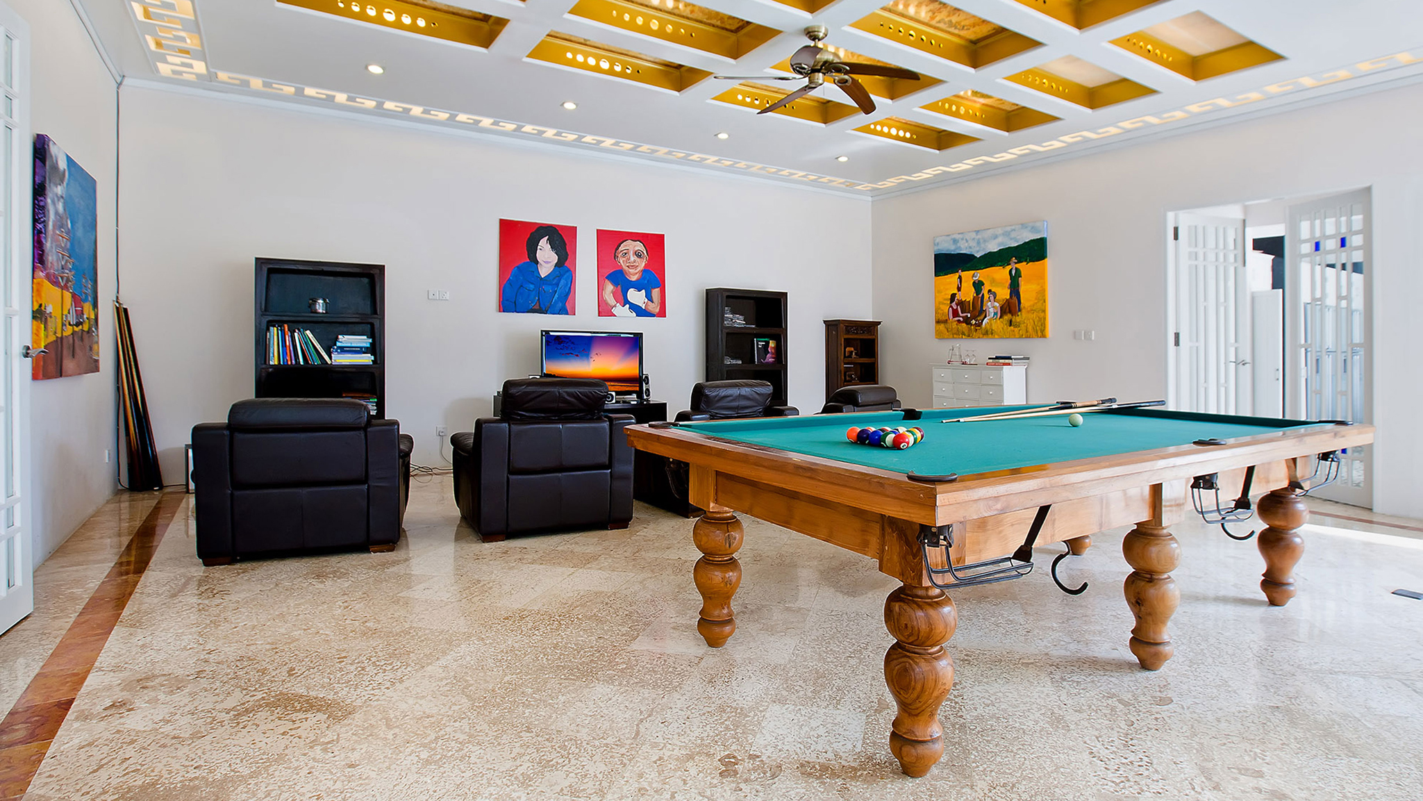 Indoor living - Formal air-conditioned living room opening onto a sun terrace. Air-conditioned dining room with timber table seating 20 . Large upper-level sea-facing living room, with four-poster bed, and semi-circular seating. Upper-level open-sided lounge area with table for six and pool table. Reception hall . Air-conditioned media room with TV, DVD player, and Playstation. State-of-the-art kitchen . Joglo spa with massage beds, hair styling and mani/pedi sections, shower courtyard, and an open-air bathroom  .
