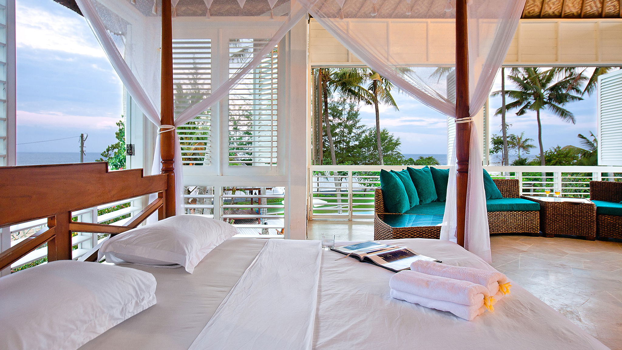 Sea View Guest Suite - On the upper floor of the main villa. Sweeping sea views from the four-poster king-size bed. Private balcony with wrought iron furniture and a killer sea view. Ensuite shower room with single vanity. Air-conditioned .