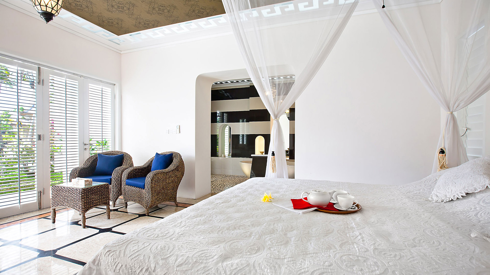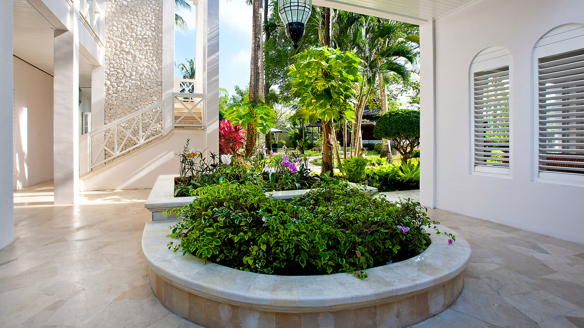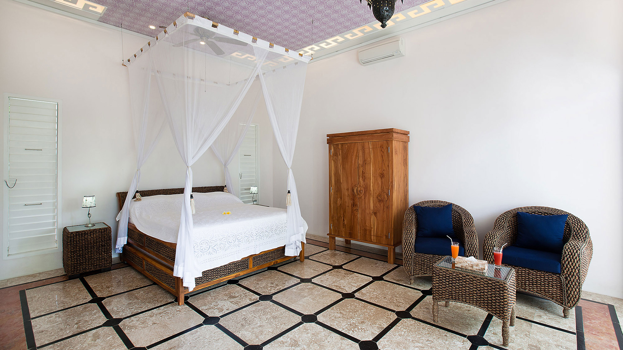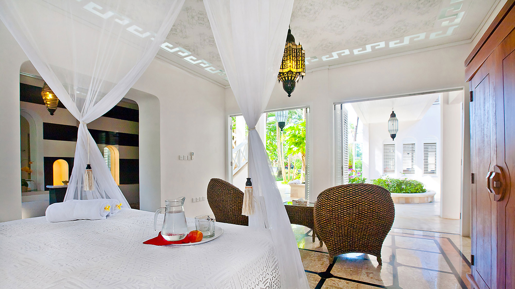 Garden Wing Guest Suites - Four large air-conditioned guest suites, two upstairs, and two downstairs opening onto the garden. Each with king-size four-poster bed and a queen-size trundle bed below. Ensuite bathrooms with walk-in shower, twin vanities and large bathtub. Plantation shutters allow the sea breeze. Access via stairs or elevator. Accessible for guests with limited mobility.