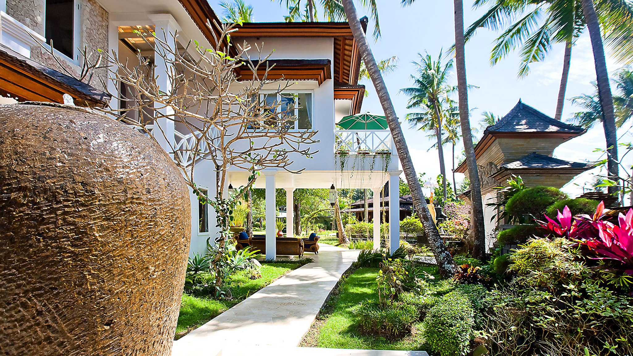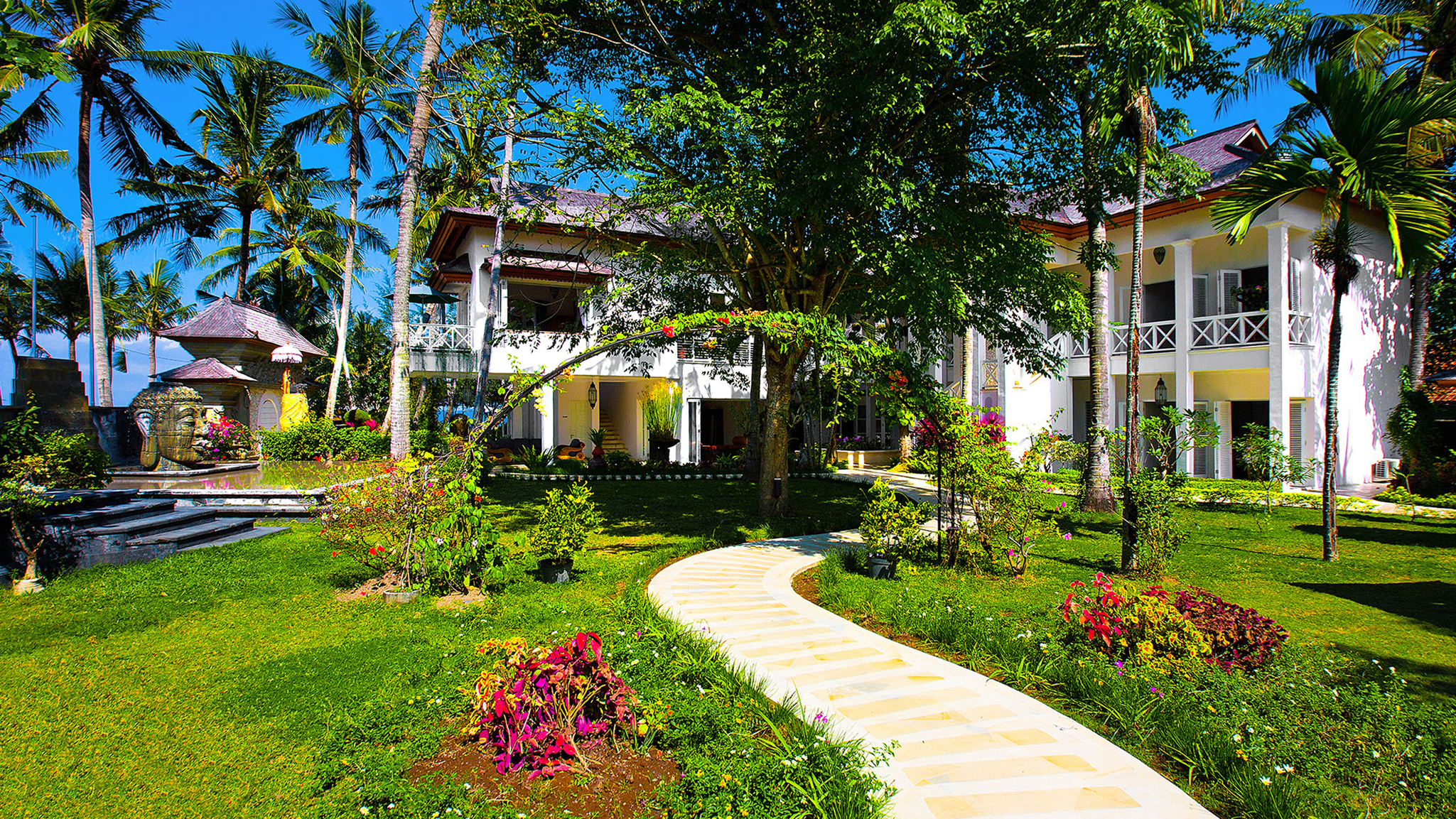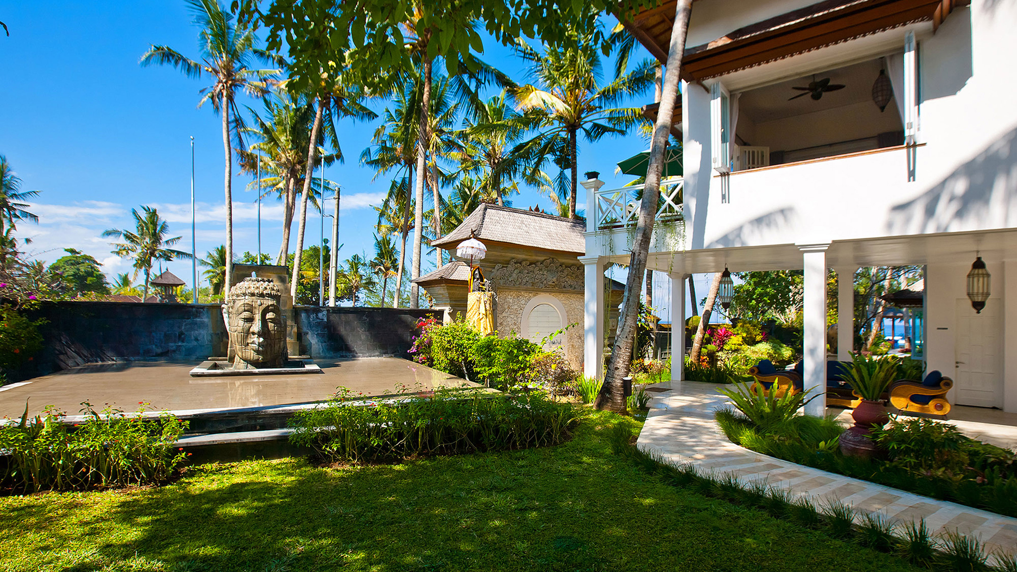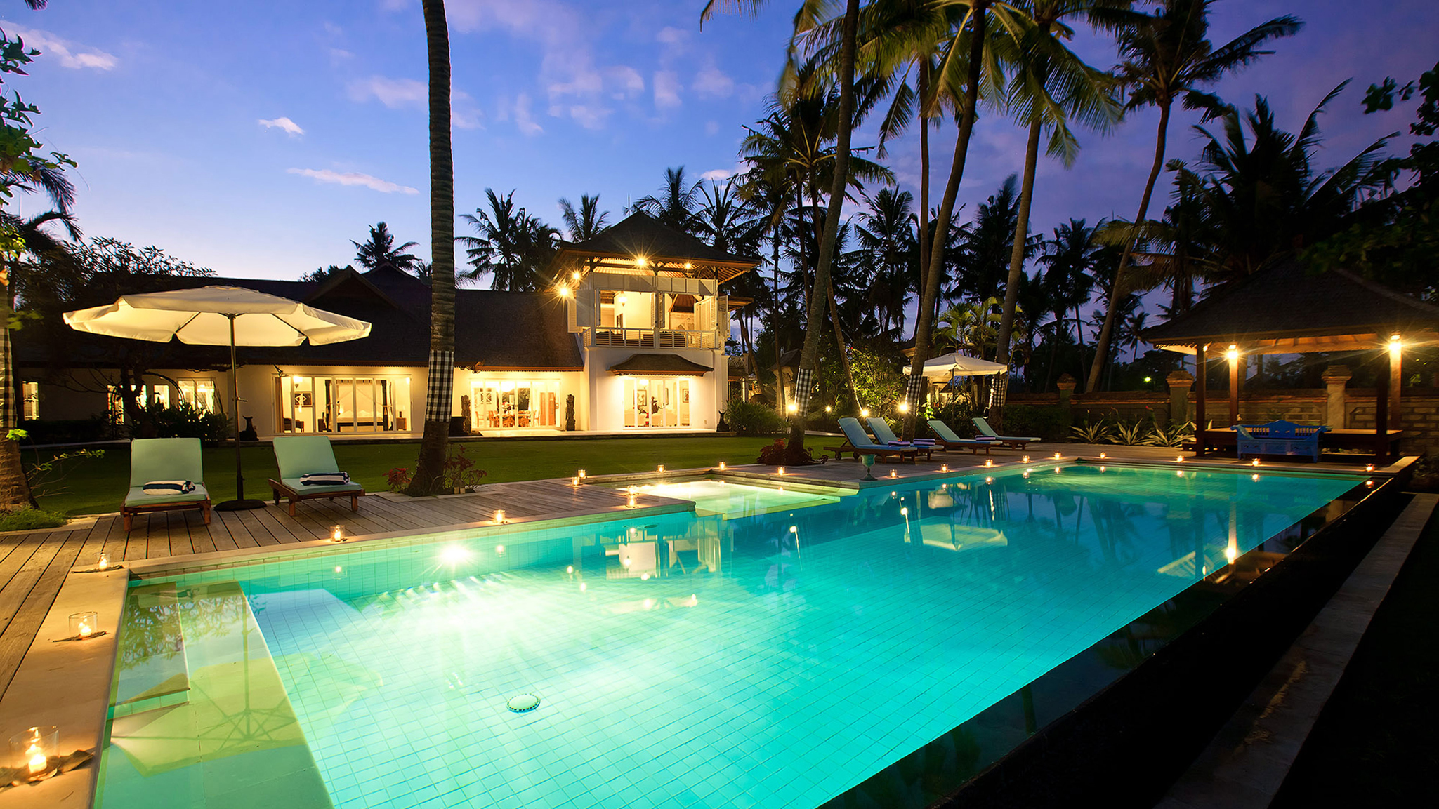 A 20-minute drive from Sanur on Bali’s south-eastern coast, the modern-meets-colonial-style Puri Nirwana enjoys fabulous sea views and direct access onto a black-sand surfing beach. The fully staffed villa can comfortably accommodate up to 20 guests in six large suites. There’s plenty of room for everyone to enjoy their own breathing space — multiple living areas, a media room, poolside gazebos and a dedicated spa. Picture-perfect for memorable family gatherings, special celebrations and intimate weddings, it will also appeal to guests with limited mobility; it has been designed to be wheelchair-friendly, with wide corridors and doors, garden ramps and even an elevator.