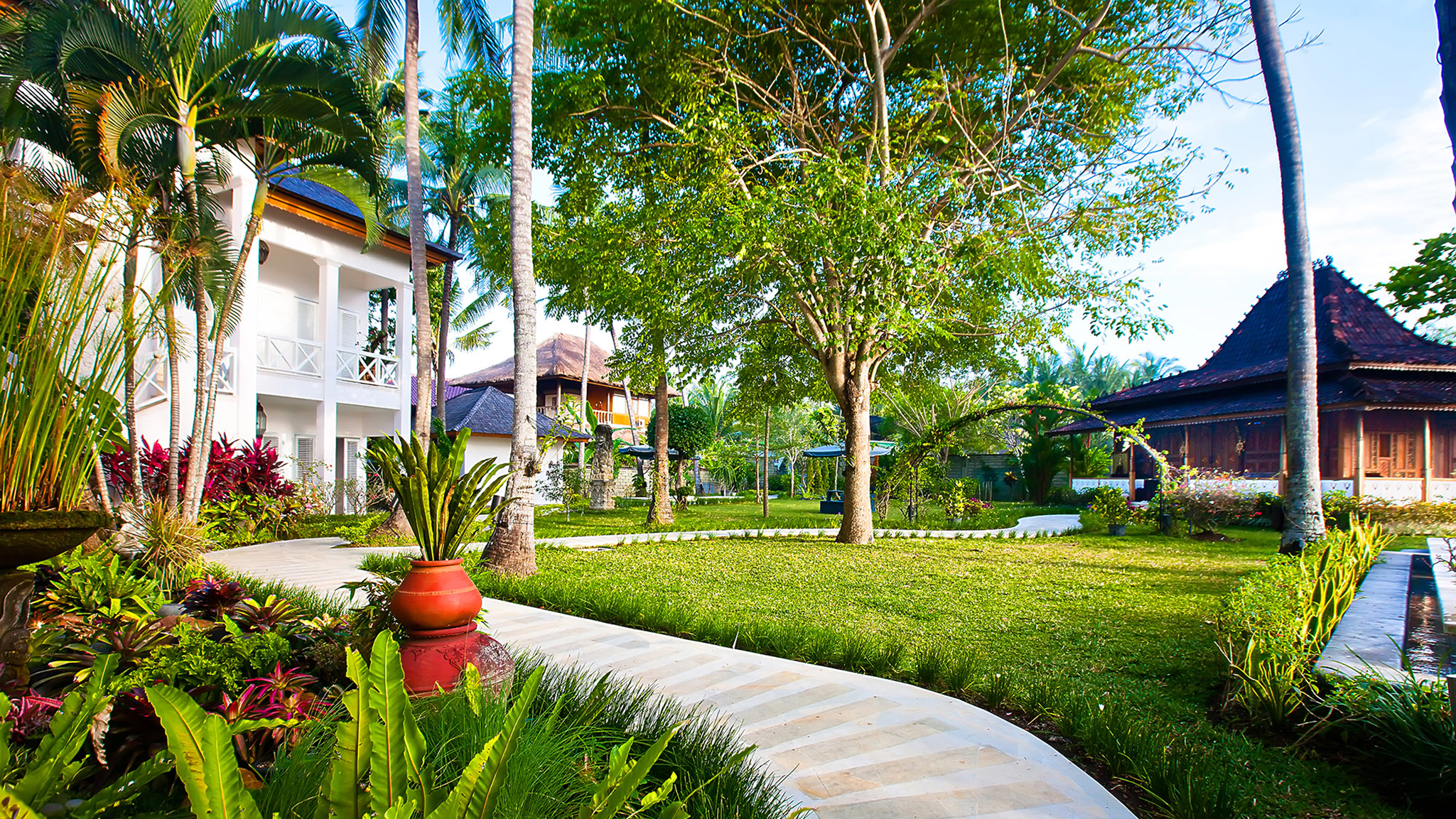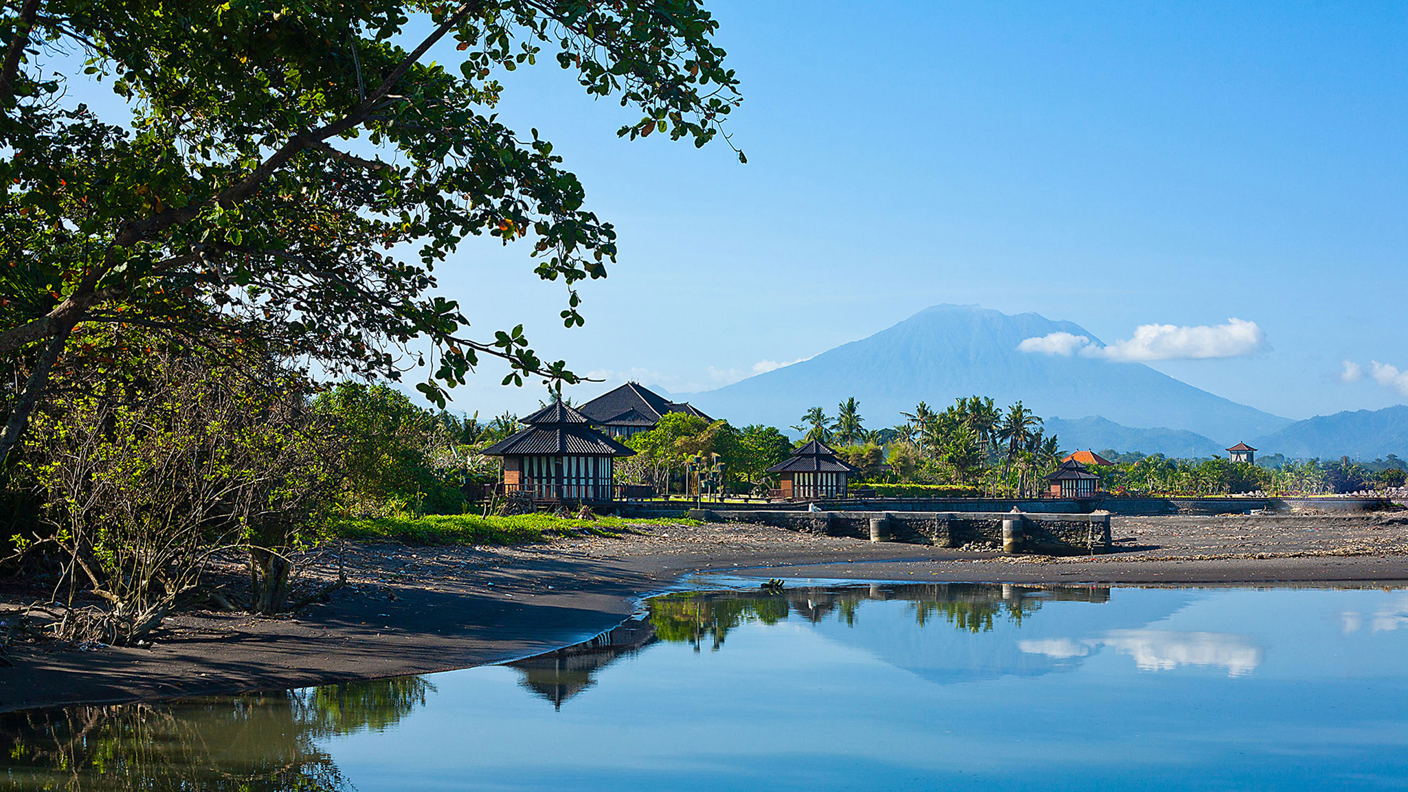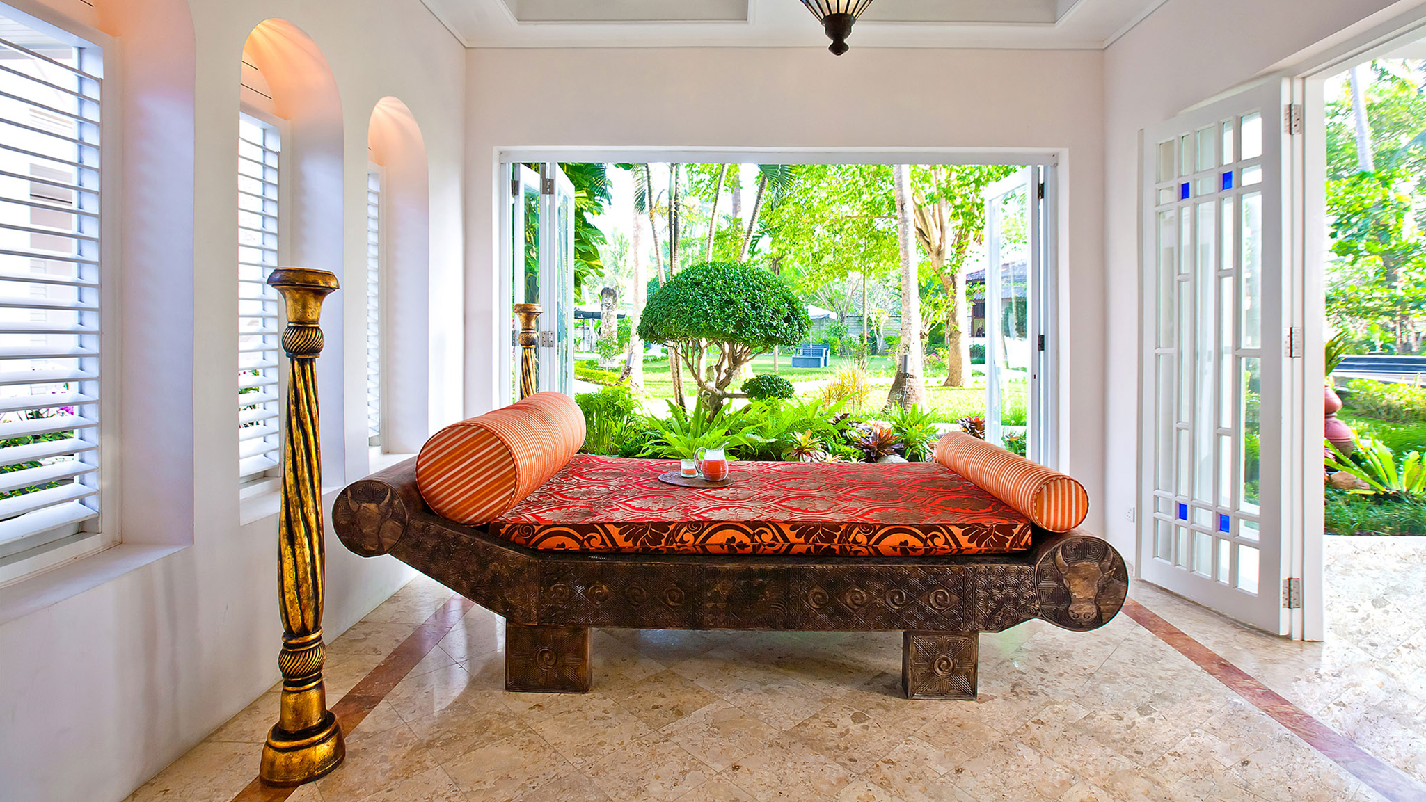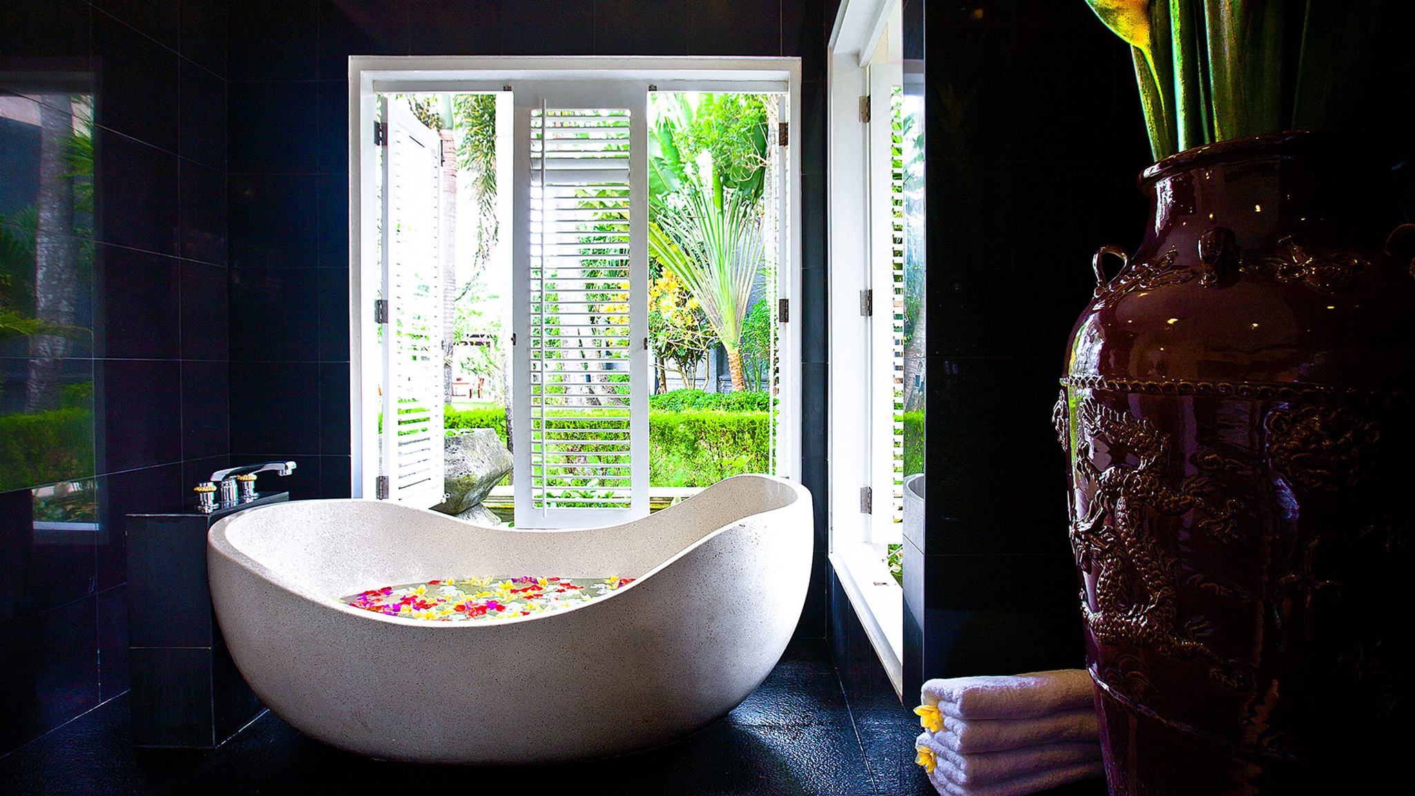 A 20-minute drive from Sanur on Bali’s south-eastern coast, the modern-meets-colonial-style Puri Nirwana enjoys fabulous sea views and direct access onto a black-sand surfing beach. The fully staffed villa can comfortably accommodate up to 20 guests in six large suites. There’s plenty of room for everyone to enjoy their own breathing space — multiple living areas, a media room, poolside gazebos and a dedicated spa. Picture-perfect for memorable family gatherings, special celebrations and intimate weddings, it will also appeal to guests with limited mobility; it has been designed to be wheelchair-friendly, with wide corridors and doors, garden ramps and even an elevator.