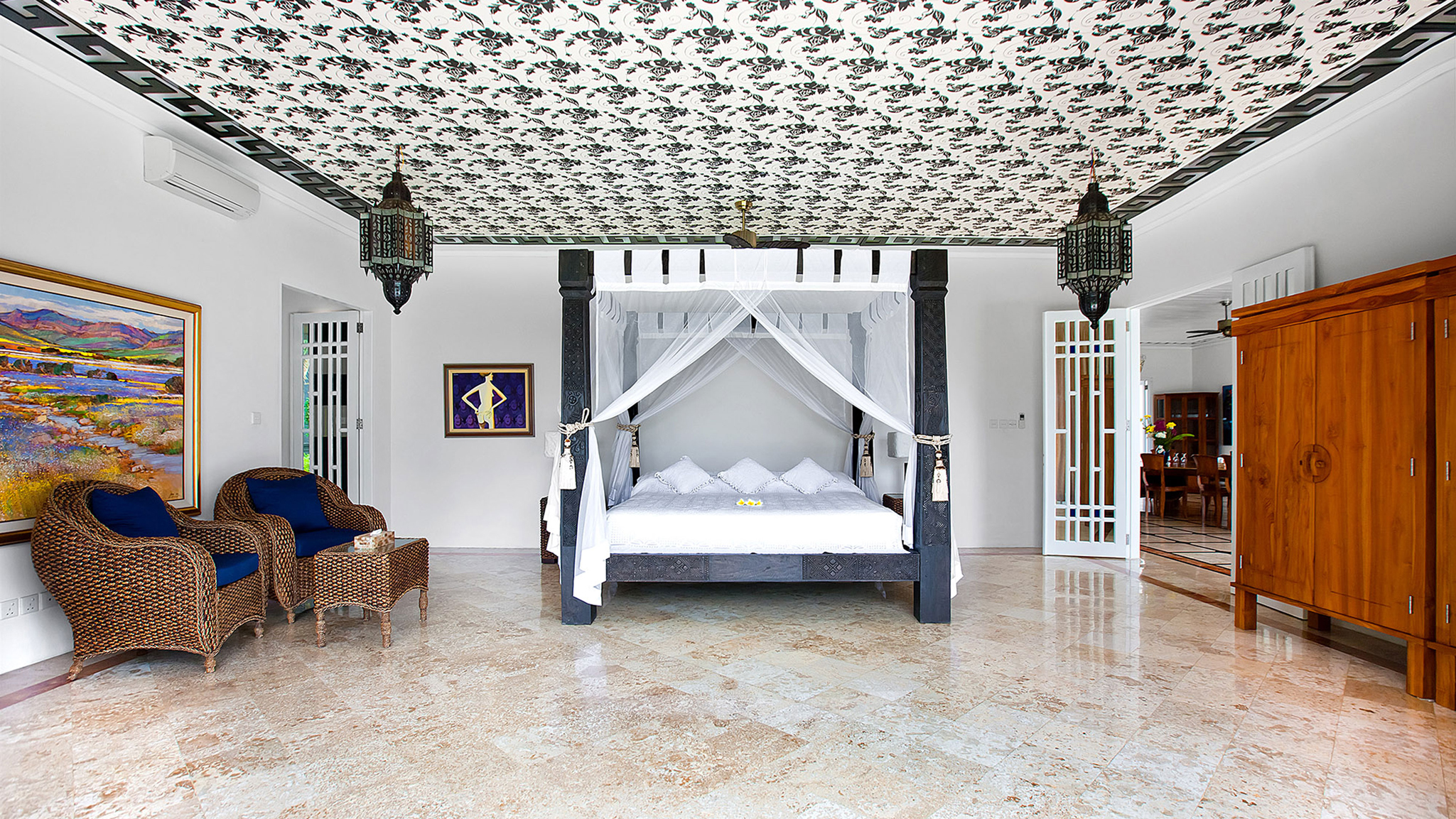 Master Bedroom Suite - Air-conditioned ground-floor master suite overlooking lawn, pool and ocean. Comfortable four-poster king-size bed . Enormous air-conditioned bathroom with walk-in wardrobe, two rain-showers and statement bathtub. Private entrance onto garden terrace. Accessible for guests with limited mobility .