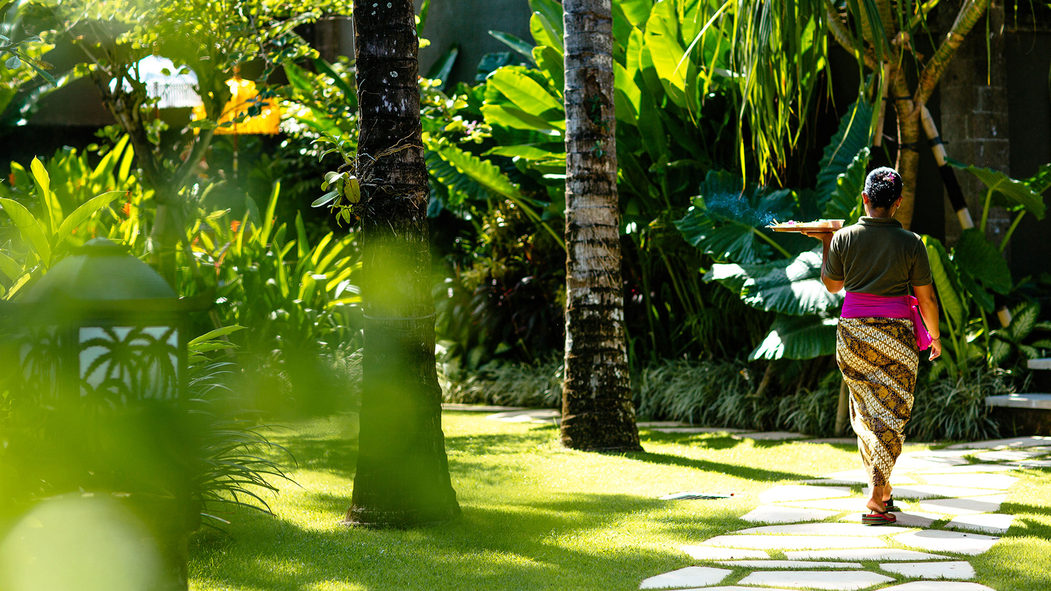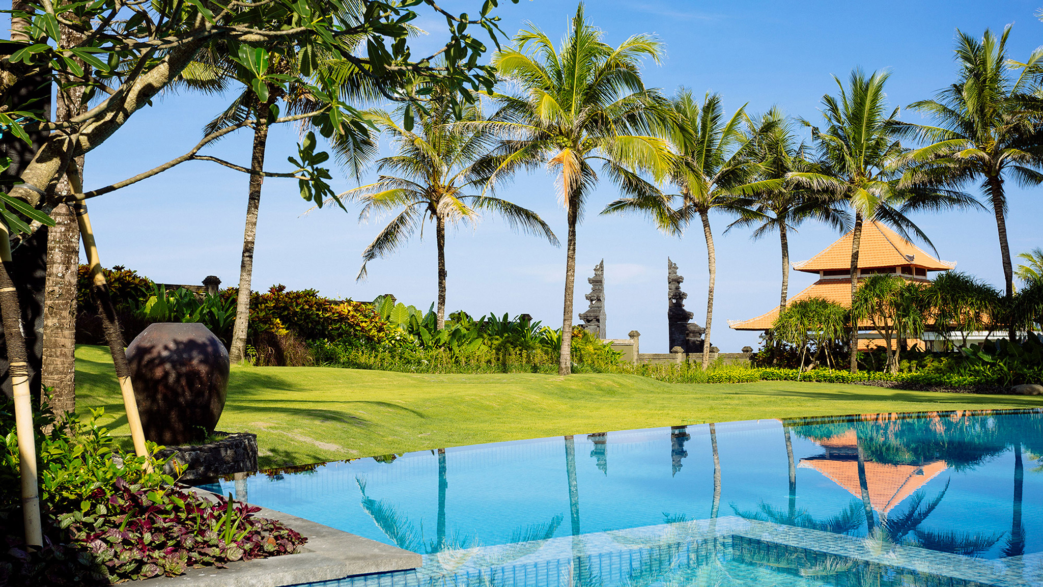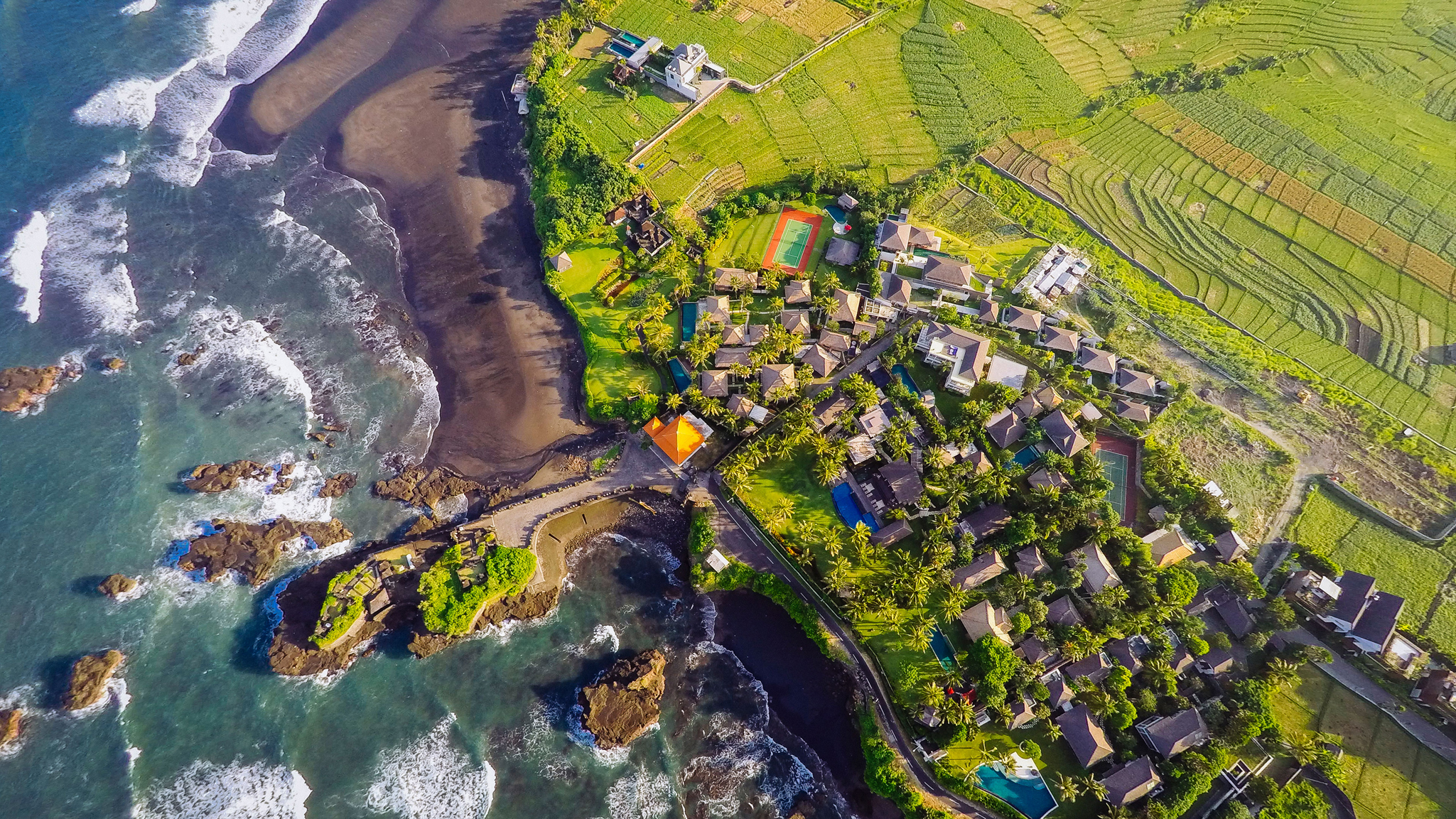 Villa Semarapura overlooks a magical sea temple crowning a dramatic outcrop of black volcanic rock on Bali’s south-west coast. Boasting breath-taking ocean views just beyond its vast rolling lawns, this beautifully designed villa features five luxurious bedroom suites, formal living and dining pavilions, a media room, and 20-metre swimming pool. The charming staff work hard to deliver a unique and memorable experience, from serving up succulent seafood feasts and mixing exotic cocktails at the bar, to arranging spa treatments in the massage bale and guiding guests on rice-field walks.