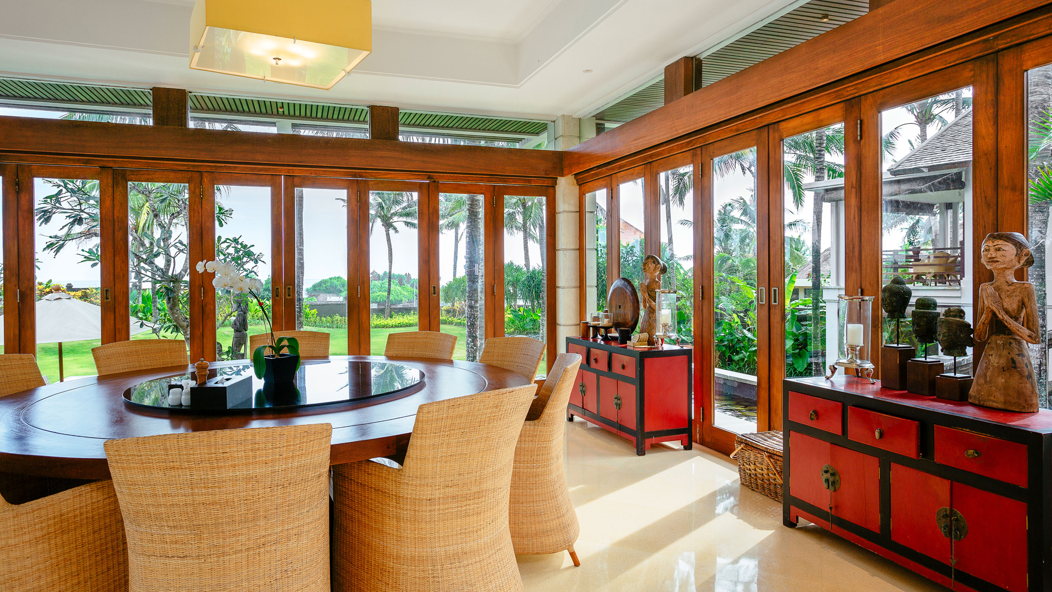 Living areas - Open-sided living room; media room with pool table; dining pavilion with table for 10; kitchen with breakfast bar; poolside dining deck with table for 10; sunset balé.