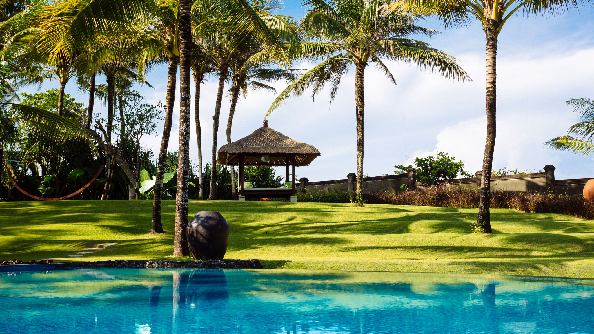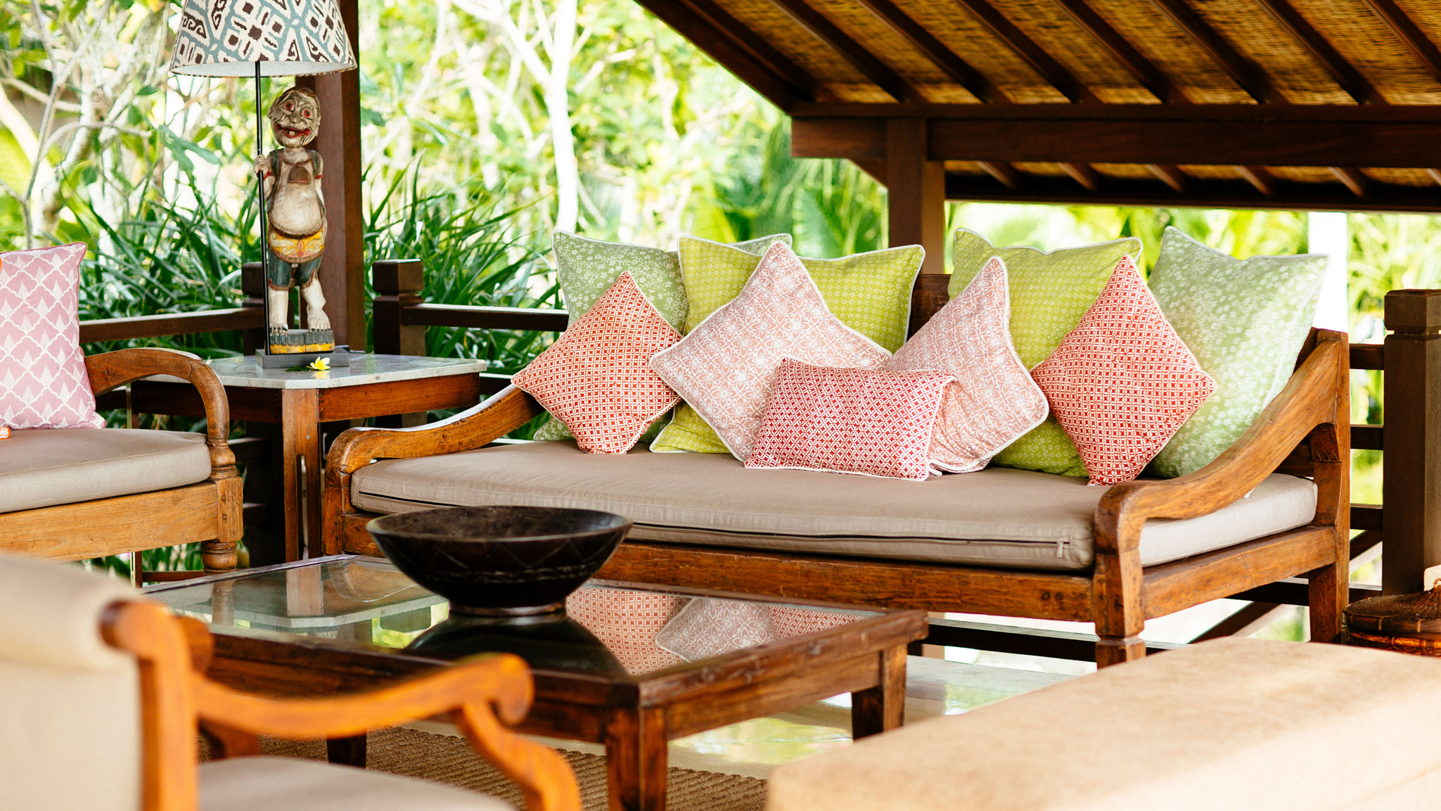 Outdoor Living - 20-metre swimming pool with large ironwood terrace furnished with sunbeds and shade umbrellas. Master bedroom terrace with Jacuzzi. Poolside alfresco dining area with table for 10. Sunset balé with ocean and temple views. Garden massage balé. Verandas and seating areas to all bedrooms. Volleyball.