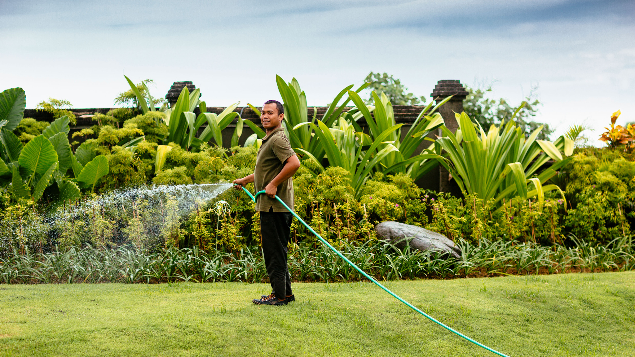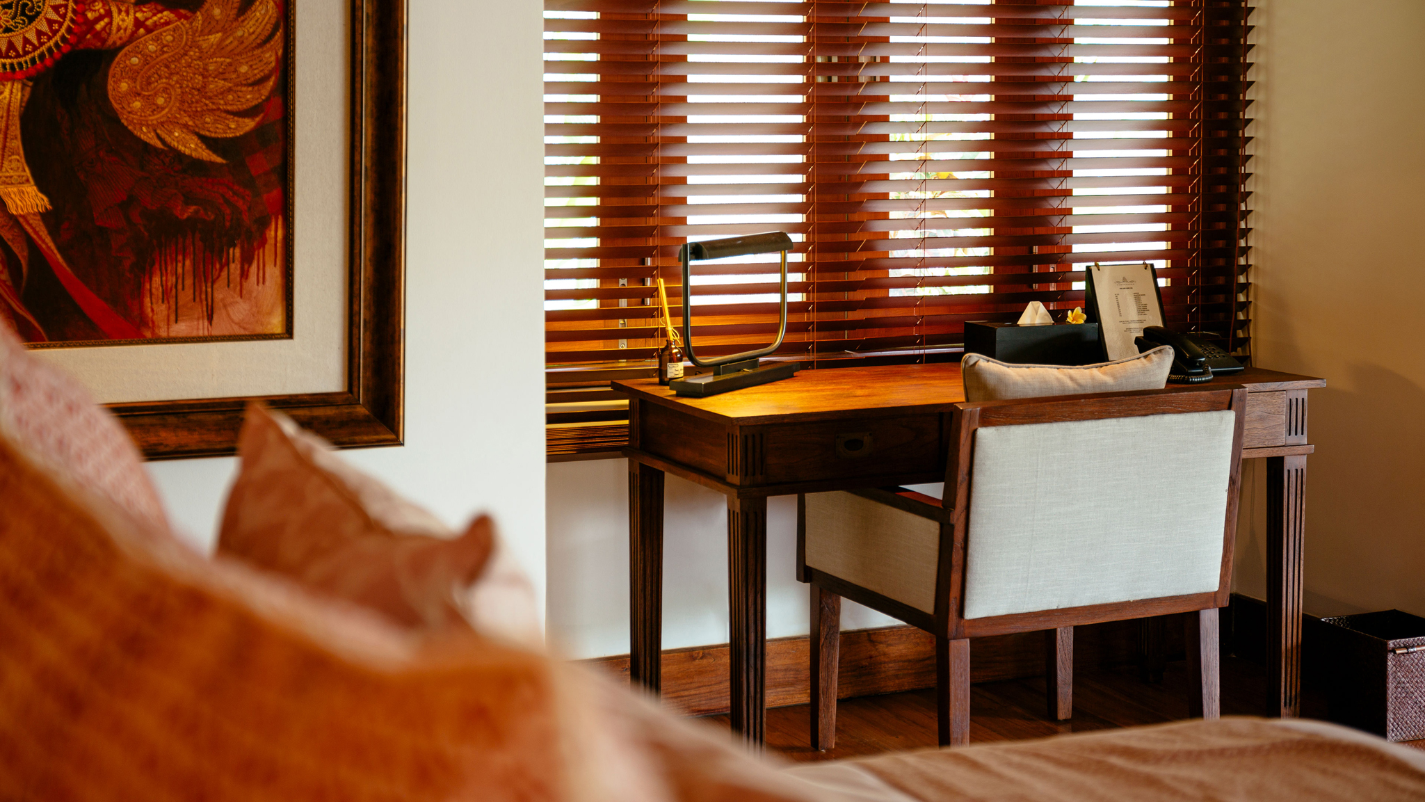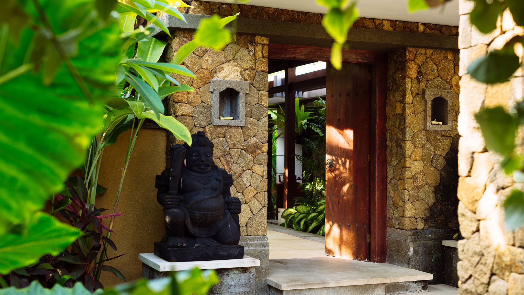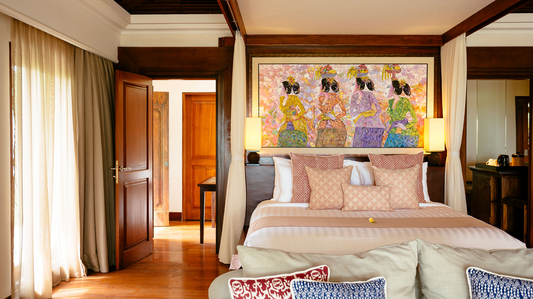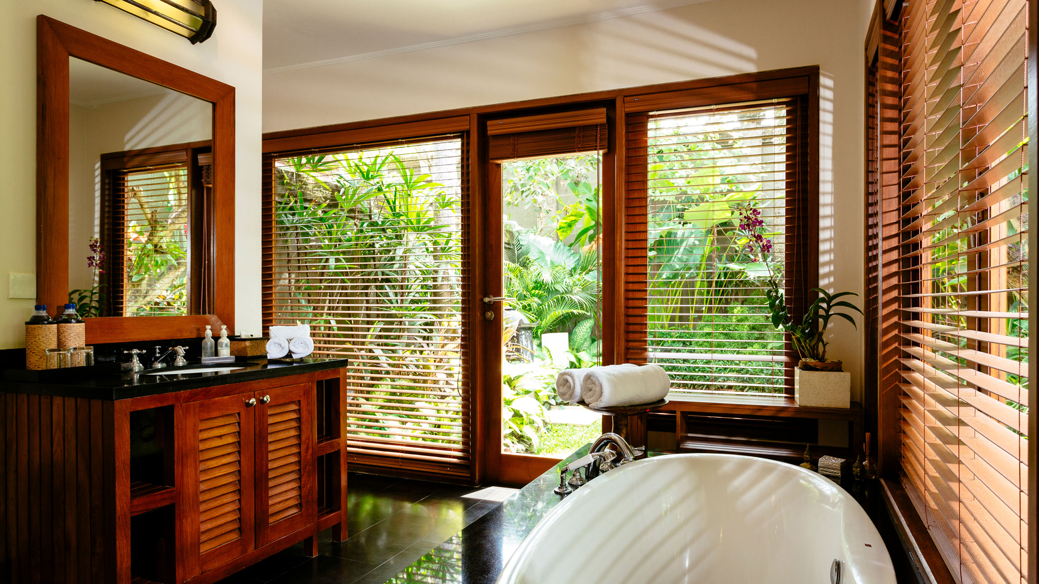 The Garden Suites - Two guest bedroom suites, each occupying its own vaulted pavilion. Entrance across lotus ponds, with shred outdoor seating area. Air-conditioned, with four-poster king-size beds and sitting area. Air-conditioned bathrooms with bathtub, double vanity, walk-in monsoon shower and alfresco shower in private walled garden. Both rooms have 32-inch satellite TVs, Bose, iPod dock, safe and bar fridge.